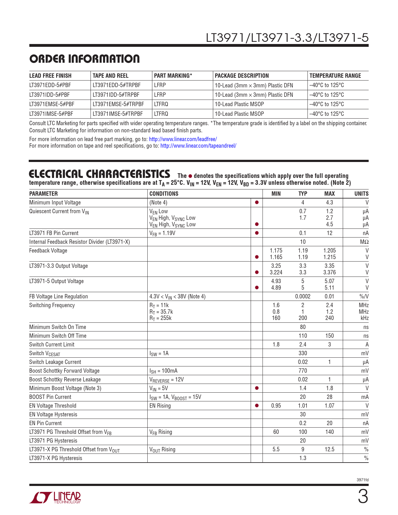 LT3971/LT3971-3.3/LT3971-5 ORDER INFORMATION LEAD FREE FINISHTAPE AND REELPART MARKING*PACKAGE DESCRIPTIONTEMPERATURE RANGE LT3971EDD-5#PBF LT3971EDD-5#TRPBF LFRP 10-Lead (3mm × 3mm) Plastic DFN –40°C to 125°C LT3971IDD-5#PBF LT3971IDD-5#TRPBF LFRP 10-Lead (3mm × 3mm) Plastic DFN –40°C to 125°C LT3971EMSE-5#PBF LT3971EMSE-5#TRPBF LTFRQ 10-Lead Plastic MSOP –40°C to 125°C LT3971IMSE-5#PBF LT3971IMSE-5#TRPBF LTFRQ 10-Lead Plastic MSOP –40°C to 125°C Consult LTC Marketing for parts specified with wider operating temperature ranges. *The temperature grade is identified by a label on the shipping container. Consult LTC Marketing for information on non-standard lead based finish parts. For more information on lead free part marking, go to: http://www.linear.com/leadfree/ For more information on tape and reel specifications, go to: http://www.linear.com/tapeandreel/ ELECTRICAL CHARACTERISTICSThe l denotes the specifications which apply over the full operatingtemperature range, otherwise specifications are at TA = 25°C. VIN = 12V, VEN = 12V, VBD = 3.3V unless otherwise noted. (Note 2) PARAMETERCONDITIONSMINTYPMAXUNITS Minimum Input Voltage (Note 4) l 4 4.3 V Quiescent Current from VIN VEN Low 0.7 1.2 μA VEN High, VSYNC Low 1.7 2.7 μA VEN High, VSYNC Low l 4.5 μA LT3971 FB Pin Current VFB = 1.19V l 0.1 12 nA Internal Feedback Resistor Divider (LT3971-X) 10 MΩ Feedback Voltage 1.175 1.19 1.205 V l 1.165 1.19 1.215 V LT3971-3.3 Output Voltage 3.25 3.3 3.35 V l 3.224 3.3 3.376 V LT3971-5 Output Voltage 4.93 5 5.07 V l 4.89 5 5.11 V FB Voltage Line Regulation 4.3V < VIN < 38V (Note 4) 0.0002 0.01 %/V Switching Frequency RT = 11k 1.6 2 2.4 MHz RT = 35.7k 0.8 1 1.2 MHz RT = 255k 160 200 240 kHz Minimum Switch On Time 80 ns Minimum Switch Off Time 110 150 ns Switch Current Limit 1.8 2.4 3 A Switch VCESAT ISW = 1A 330 mV Switch Leakage Current 0.02 1 μA Boost Schottky Forward Voltage ISH = 100mA 770 mV Boost Schottky Reverse Leakage VREVERSE = 12V 0.02 1 μA Minimum Boost Voltage (Note 3) VIN = 5V l 1.4 1.8 V BOOST Pin Current ISW = 1A, VBOOST = 15V 20 28 mA EN Voltage Threshold EN Rising l 0.95 1.01 1.07 V EN Voltage Hysteresis 30 mV EN Pin Current 0.2 20 nA LT3971 PG Threshold Offset from VFB VFB Rising 60 100 140 mV LT3971 PG Hysteresis 20 mV LT3971-X PG Threshold Offset from VOUT VOUT Rising 5.5 9 12.5 % LT3971-X PG Hysteresis 1.3 % 3971fd 3 Document Outline Features Applications Description Typical Application Absolute Maximum Ratings Pin Configuration Order Information Electrical Characteristics Typical Performance Characteristics Pin Functions Block Diagram Operation Applications Information Typical Applications Package Description Revision History Related Parts