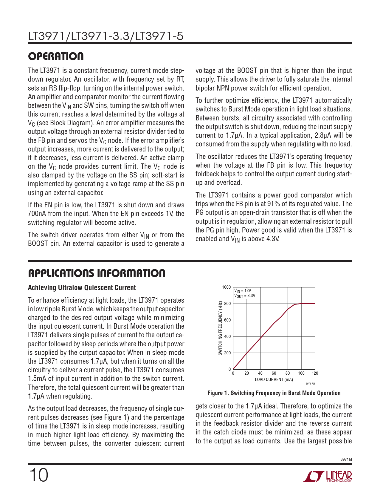 LT3971/LT3971-3.3/LT3971-5 OPERATION The LT3971 is a constant frequency, current mode step- voltage at the BOOST pin that is higher than the input down regulator. An oscillator, with frequency set by RT, supply. This allows the driver to fully saturate the internal sets an RS flip-flop, turning on the internal power switch. bipolar NPN power switch for efficient operation. An amplifier and comparator monitor the current flowing To further optimize efficiency, the LT3971 automatically between the VIN and SW pins, turning the switch off when switches to Burst Mode operation in light load situations. this current reaches a level determined by the voltage at Between bursts, all circuitry associated with controlling VC (see Block Diagram). An error amplifier measures the the output switch is shut down, reducing the input supply output voltage through an external resistor divider tied to current to 1.7μA. In a typical application, 2.8μA will be the FB pin and servos the VC node. If the error amplifier’s consumed from the supply when regulating with no load. output increases, more current is delivered to the output; if it decreases, less current is delivered. An active clamp The oscillator reduces the LT3971’s operating frequency on the VC node provides current limit. The VC node is when the voltage at the FB pin is low. This frequency also clamped by the voltage on the SS pin; soft-start is foldback helps to control the output current during start- implemented by generating a voltage ramp at the SS pin up and overload. using an external capacitor. The LT3971 contains a power good comparator which If the EN pin is low, the LT3971 is shut down and draws trips when the FB pin is at 91% of its regulated value. The 700nA from the input. When the EN pin exceeds 1V, the PG output is an open-drain transistor that is off when the switching regulator will become active. output is in regulation, allowing an external resistor to pull the PG pin high. Power good is valid when the LT3971 is The switch driver operates from either VIN or from the enabled and V BOOST pin. An external capacitor is used to generate a IN is above 4.3V. APPLICATIONS INFORMATION Achieving Ultralow Quiescent Current 1000 VIN = 12V To enhance efficiency at light loads, the LT3971 operates VOUT = 3.3V 800 in low ripple Burst Mode, which keeps the output capacitor charged to the desired output voltage while minimizing 600 the input quiescent current. In Burst Mode operation the LT3971 delivers single pulses of current to the output ca- 400 pacitor followed by sleep periods where the output power is supplied by the output capacitor. When in sleep mode SWITCHING FREQUENCY (kHz) 200 the LT3971 consumes 1.7μA, but when it turns on all the circuitry to deliver a current pulse, the LT3971 consumes 0 0 20 40 60 80 100 120 1.5mA of input current in addition to the switch current. LOAD CURRENT (mA) Therefore, the total quiescent current will be greater than 3971 F01 1.7μA when regulating. Figure 1. Switching Frequency in Burst Mode Operation As the output load decreases, the frequency of single cur- gets closer to the 1.7μA ideal. Therefore, to optimize the rent pulses decreases (see Figure 1) and the percentage quiescent current performance at light loads, the current of time the LT3971 is in sleep mode increases, resulting in the feedback resistor divider and the reverse current in much higher light load efficiency. By maximizing the in the catch diode must be minimized, as these appear time between pulses, the converter quiescent current to the output as load currents. Use the largest possible 3971fd 10 Document Outline Features Applications Description Typical Application Absolute Maximum Ratings Pin Configuration Order Information Electrical Characteristics Typical Performance Characteristics Pin Functions Block Diagram Operation Applications Information Typical Applications Package Description Revision History Related Parts