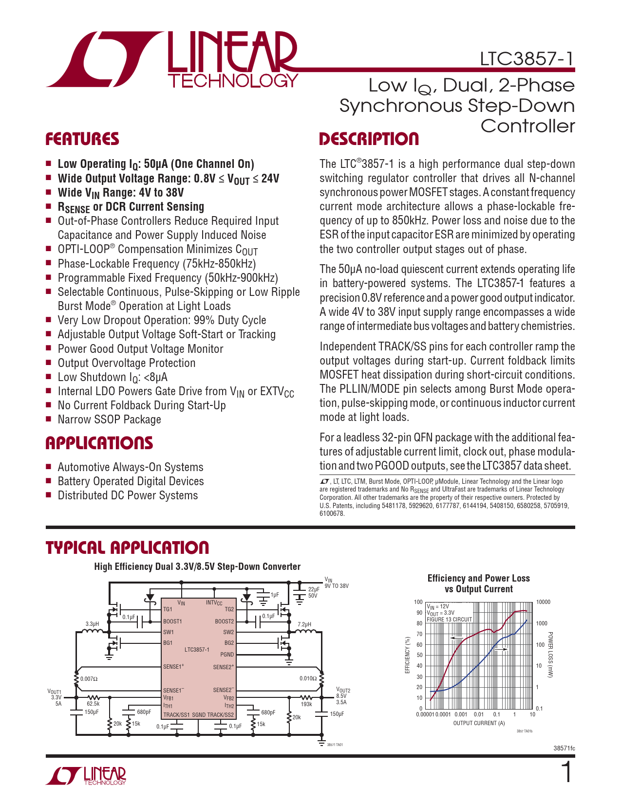 LTC3857-1 Low IQ, Dual, 2-Phase Synchronous Step-Down Controller FEATURESDESCRIPTION n Low Operating IQ: 50μA (One Channel On) The LTC®3857-1 is a high performance dual step-down n Wide Output Voltage Range: 0.8V ≤ VOUT ≤ 24V switching regulator controller that drives all N-channel n Wide VIN Range: 4V to 38V synchronous power MOSFET stages. A constant frequency n RSENSE or DCR Current Sensing current mode architecture allows a phase-lockable fre- n Out-of-Phase Controllers Reduce Required Input quency of up to 850kHz. Power loss and noise due to the Capacitance and Power Supply Induced Noise ESR of the input capacitor ESR are minimized by operating n OPTI-LOOP® Compensation Minimizes COUT the two controller output stages out of phase. n Phase-Lockable Frequency (75kHz-850kHz) The 50μA no-load quiescent current extends operating life n Programmable Fixed Frequency (50kHz-900kHz) in battery-powered systems. The LTC3857-1 features a n Selectable Continuous, Pulse-Skipping or Low Ripple precision 0.8V reference and a power good output indicator. Burst Mode® Operation at Light Loads A wide 4V to 38V input supply range encompasses a wide n Very Low Dropout Operation: 99% Duty Cycle range of intermediate bus voltages and battery chemistries. n Adjustable Output Voltage Soft-Start or Tracking n Power Good Output Voltage Monitor Independent TRACK/SS pins for each controller ramp the n Output Overvoltage Protection output voltages during start-up. Current foldback limits n Low Shutdown I MOSFET heat dissipation during short-circuit conditions. Q: <8μA n Internal LDO Powers Gate Drive from V The PLLIN/MODE pin selects among Burst Mode opera- IN or EXTVCC n No Current Foldback During Start-Up tion, pulse-skipping mode, or continuous inductor current n Narrow SSOP Package mode at light loads. APPLICATIONS For a leadless 32-pin QFN package with the additional fea- tures of adjustable current limit, clock out, phase modula- n Automotive Always-On Systems tion and two PGOOD outputs, see the LTC3857 data sheet. n Battery Operated Digital Devices L, LT, LTC, LTM, Burst Mode, OPTI-LOOP, μModule, Linear Technology and the Linear logo are registered trademarks and No R n Distributed DC Power Systems SENSE and UltraFast are trademarks of Linear Technology Corporation. All other trademarks are the property of their respective owners. Protected by U.S. Patents, including 5481178, 5929620, 6177787, 6144194, 5408150, 6580258, 5705919, 6100678. TYPICAL APPLICATIONHigh Efficiency Dual 3.3V/8.5V Step-Down Converter VIN Efficiency and Power Loss 9V TO 38V 22μF vs Output Current 1μF 50V VIN INTVCC 100 10000 V TG1 TG2 IN = 12V 90 V 0.1μF 0.1μF OUT = 3.3V FIGURE 13 CIRCUIT 3.3μH BOOST1 BOOST2 7.2μH 80 1000 SW1 SW2 POWER LOSS (mW) 70 BG1 BG2 60 100 LTC3857-1 PGND 50 SENSE1+ SENSE2+ 40 10 EFFICIENCY (%) 0.007Ω 0.010Ω 30 20 1 V V OUT1 SENSE1– SENSE2– OUT2 3.3V 8.5V VFB1 VFB2 10 5A 62.5k I 193k 3.5A TH1 ITH2 0 0.1 150μF 680pF 680pF TRACK/SS1 TRACK/SS2 150μF SGND 20k 0.00001 0.0001 0.001 0.01 0.1 1 10 20k 15k 15k OUTPUT CURRENT (A) 0.1μF 0.1μF 3857 TA01b 38571 TA01 38571fc 1 Document Outline FEATURES DESCRIPTION APPLICATIONS TYPICAL APPLICATION ABSOLUTE MAXIMUM RATINGS PIN CONFIGURATION ORDER INFORMATION ELECTRICAL CHARACTERISTICS TYPICAL PERFORMANCE CHARACTERISTICS PIN FUNCTIONS FUNCTIONAL DIAGRAM OPERATION APPLICATIONS INFORMATION TYPICAL APPLICATIONS PACKAGE DESCRIPTION REVISION HISTORY TYPICAL APPLICATION RELATED PARTS