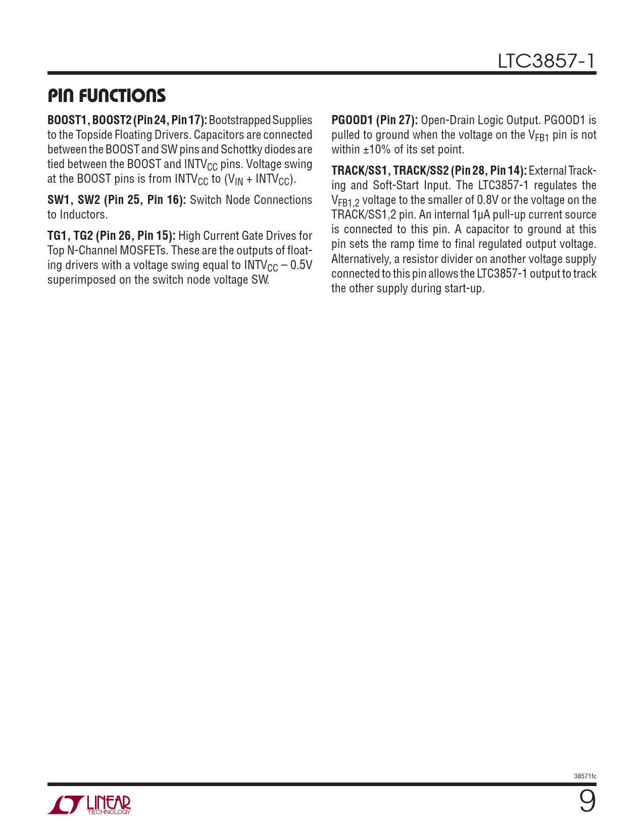 PIN FUNCTIONS. BOOST1, BOOST2 (Pin 24, Pin 17):. PGOOD1 (Pin 27):. TRACK/SS1, TRACK/SS2 (Pin 28, Pin 14):