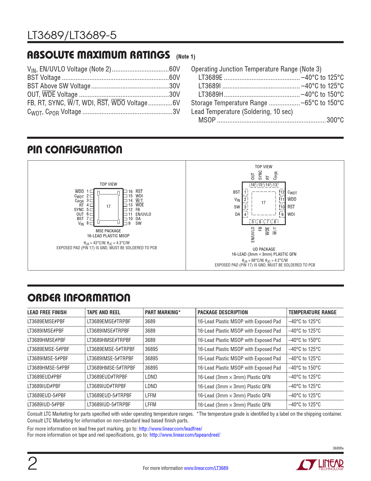 LT3689/LT3689-5 ABSOLUTE MAXIMUM RATINGS (Note 1) VIN, EN/UVLO Voltage (Note 2) ...60V Operating Junction Temperature Range (Note 3) BST Voltage ..60V LT3689E .. –40°C to 125°C BST Above SW Voltage ...30V LT3689I ... –40°C to 125°C OUT, WDE Voltage ..30V LT3689H .. –40°C to 150°C FB, RT, SYNC, W/T, WDI, RST, WDO Voltage ..6V Storage Temperature Range .. –65°C to 150°C CWDT, CPOR Voltage ..3V Lead Temperature (Soldering, 10 sec) MSOP ...300°C PIN CONFIGURATION TOP VIEW OUT SYNC RT C POR TOP VIEW 16 15 14 13 WDO 1 16 RST BST 1 12 CWDT C 2 WDT 15 WDI C 3 POR 14 W/T VIN 2 11 WDO RT 4 13 WDE 17 17 SW 3 10 RST SYNC 5 12 FB OUT 6 11 EN/UVLO DA 4 9 WDI BST 7 10 DA V 8 5 6 7 8 IN 9 SW MSE PACKAGE FB /T 16-LEAD PLASTIC MSOP WDE W θ EN/UVLO JA = 43°C/W, θJC = 4.3°C/W EXPOSED PAD (PIN 17) IS GND, MUST BE SOLDERED TO PCB UD PACKAGE 16-LEAD (3mm × 3mm) PLASTIC QFN θJA = 68°C/W, θJC = 4.2°C/W EXPOSED PAD (PIN 17) IS GND, MUST BE SOLDERED TO PCB ORDER INFORMATION LEAD FREE FINISHTAPE AND REELPART MARKING*PACKAGE DESCRIPTIONTEMPERATURE RANGE LT3689EMSE#PBF LT3689EMSE#TRPBF 3689 16-Lead Plastic MSOP with Exposed Pad –40°C to 125°C LT3689IMSE#PBF LT3689IMSE#TRPBF 3689 16-Lead Plastic MSOP with Exposed Pad –40°C to 125°C LT3689HMSE#PBF LT3689HMSE#TRPBF 3689 16-Lead Plastic MSOP with Exposed Pad –40°C to 150°C LT3689EMSE-5#PBF LT3689EMSE-5#TRPBF 36895 16-Lead Plastic MSOP with Exposed Pad –40°C to 125°C LT3689IMSE-5#PBF LT3689IMSE-5#TRPBF 36895 16-Lead Plastic MSOP with Exposed Pad –40°C to 125°C LT3689HMSE-5#PBF LT3689HMSE-5#TRPBF 36895 16-Lead Plastic MSOP with Exposed Pad –40°C to 150°C LT3689EUD#PBF LT3689EUD#TRPBF LDND 16-Lead (3mm × 3mm) Plastic QFN –40°C to 125°C LT3689IUD#PBF LT3689IUD#TRPBF LDND 16-Lead (3mm × 3mm) Plastic QFN –40°C to 125°C LT3689EUD-5#PBF LT3689EUD-5#TRPBF LFFM 16-Lead (3mm × 3mm) Plastic QFN –40°C to 125°C LT3689IUD-5#PBF LT3689IUD-5#TRPBF LFFM 16-Lead (3mm × 3mm) Plastic QFN –40°C to 125°C Consult LTC Marketing for parts specified with wider operating temperature ranges. *The temperature grade is identified by a label on the shipping container. Consult LTC Marketing for information on non-standard lead based finish parts. For more information on lead free part marking, go to: http://www.linear.com/leadfree/ For more information on tape and reel specifications, go to: http://www.linear.com/tapeandreel/ 3689fe 2 For more information www.linear.com/LT3689 Document Outline Features Applications Description Typical Application Absolute Maximum Ratings Pin Configuration Order Information Electrical Characteristics Typical Performance Characteristics Pin Functions Block Diagram Timing Diagrams Operation Applications Information Typical Applications Package Description Revision History Typical Application Related Parts