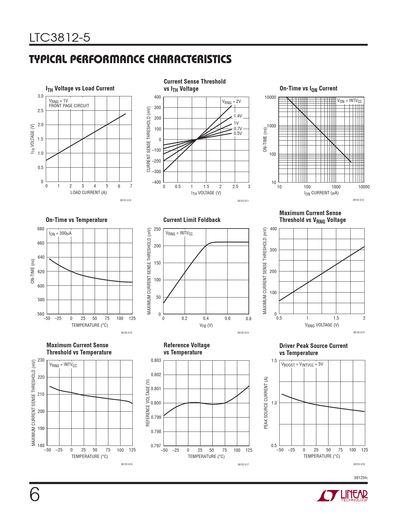 3.0 400 10000 VRNG = 1V V V RNG = 2V ON = INTVCC FRONT PAGE CIRCUIT 300 2.5 1.4V 200 2.0 1V 1000 100 0.7V 0.5V TAGE (V) 1.5 0 VOL I TH –100 ON-TIME (ns) 1.0 100 –200 0.5 CURRENT SENSE THRESHOLD (mV) –300 0 –400 10 0 1 2 3 4 5 6 7 0 0.5 1 1.5 2 2.5 3 10 100 1000 10000 LOAD CURRENT (A) ITH VOLTAGE (V) ION CURRENT (μA) 38125 G10 38125 G11 38125 G12