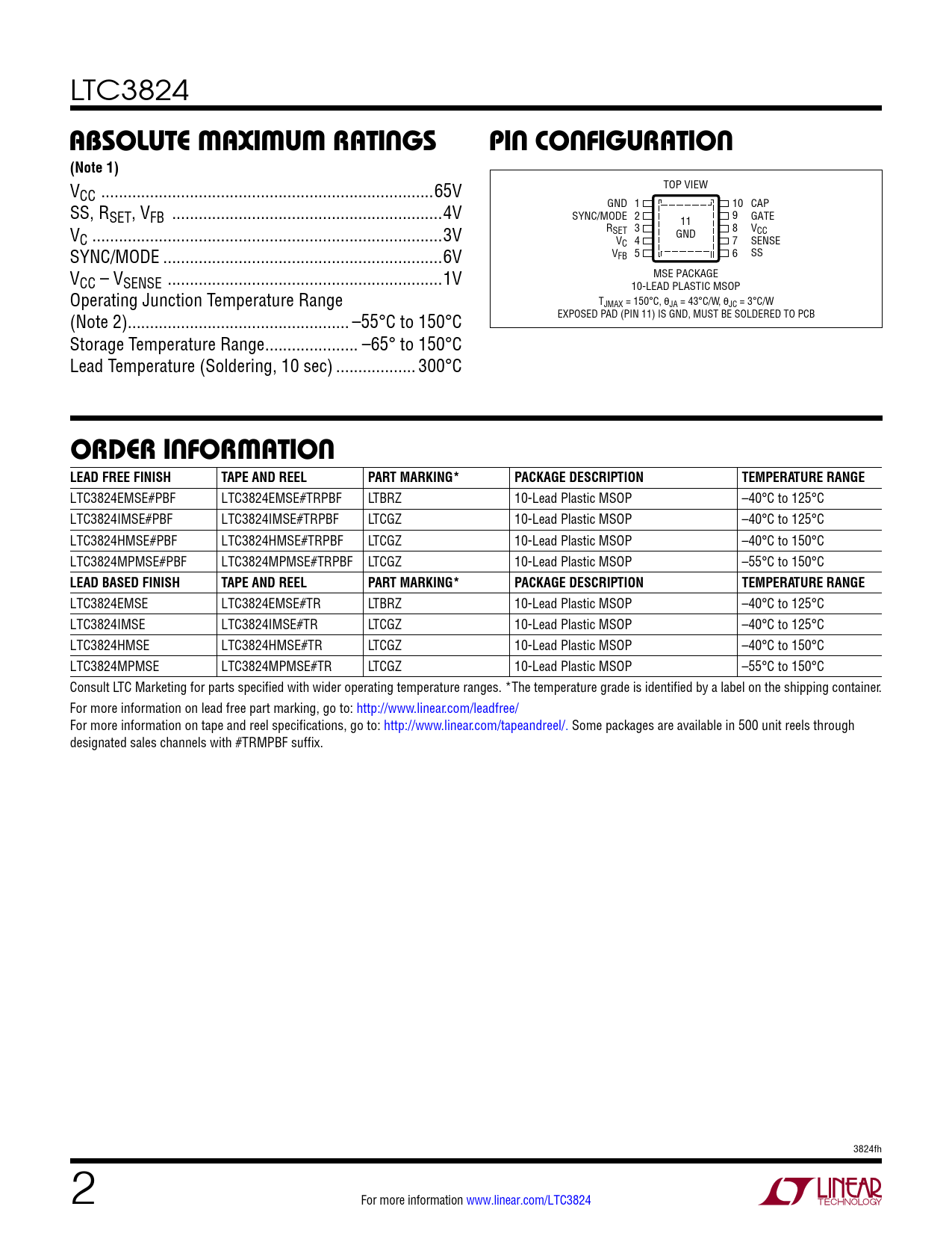 LTC3824EMSE LTC3824EMSE#TR LTBRZ 10-Lead Plastic MSOP –40°C to 125°C LTC3824IMSE LTC3824IMSE#TR LTCGZ 10-Lead Plastic MSOP –40°C to 125°C LTC3824HMSE LTC3824HMSE#TR LTCGZ 10-Lead Plastic MSOP –40°C to 150°C LTC3824MPMSE LTC3824MPMSE#TR LTCGZ 10-Lead Plastic MSOP –55°C to 150°C Consult LTC Marketing for parts specified with wider operating temperature ranges. *The temperature grade is identified by a label on the shipping container. For more information on lead free part marking, go to: http://www.linear.com/leadfree/ For more information on tape and reel specifications, go to: http://www.linear.com/tapeandreel/. Some packages are available in 500 unit reels through designated sales channels with #TRMPBF suffix. 3824fh 2 For more information www.linear.com/LTC3824 Document Outline Features Description Applications Typical Application Absolute Maximum Ratings Pin Configuration Electrical Characteristics Typical Performance Characteristics Applications Information Typical Application Related Parts