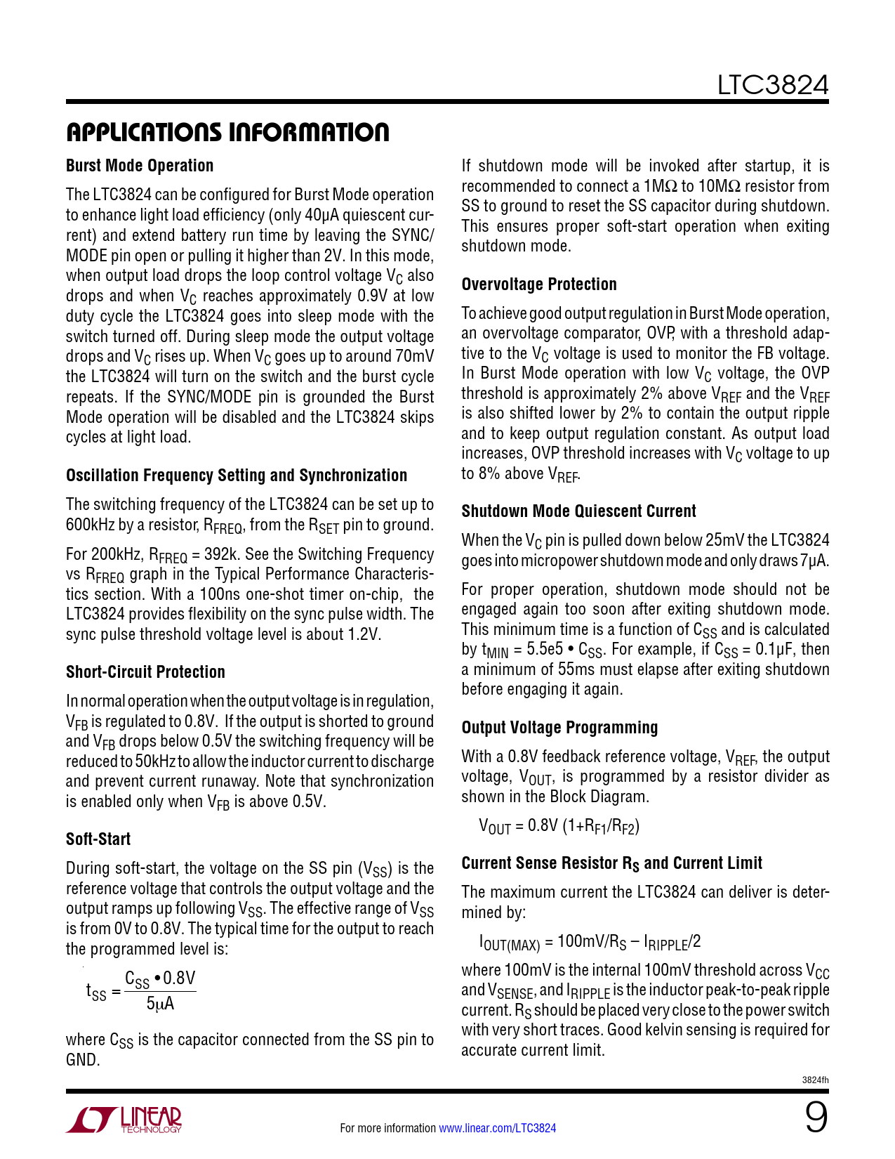 LTC3824 applicaTions inForMaTion Burst Mode Operation If shutdown mode will be invoked after startup, it is The LTC3824 can be configured for Burst Mode operation recommended to connect a 1MΩ to 10MΩ resistor from to enhance light load efficiency (only 40µA quiescent cur- SS to ground to reset the SS capacitor during shutdown. rent) and extend battery run time by leaving the SYNC/ This ensures proper soft-start operation when exiting MODE pin open or pulling it higher than 2V. In this mode, shutdown mode. when output load drops the loop control voltage VC also Overvoltage Protection drops and when VC reaches approximately 0.9V at low duty cycle the LTC3824 goes into sleep mode with the To achieve good output regulation in Burst Mode operation, switch turned off. During sleep mode the output voltage an overvoltage comparator, OVP, with a threshold adap- drops and VC rises up. When VC goes up to around 70mV tive to the VC voltage is used to monitor the FB voltage. the LTC3824 will turn on the switch and the burst cycle In Burst Mode operation with low VC voltage, the OVP repeats. If the SYNC/MODE pin is grounded the Burst threshold is approximately 2% above VREF and the VREF Mode operation will be disabled and the LTC3824 skips is also shifted lower by 2% to contain the output ripple cycles at light load. and to keep output regulation constant. As output load increases, OVP threshold increases with VC voltage to up Oscillation Frequency Setting and Synchronization to 8% above VREF. The switching frequency of the LTC3824 can be set up to Shutdown Mode Quiescent Current 600kHz by a resistor, RFREQ, from the RSET pin to ground. When the V For 200kHz, R C pin is pulled down below 25mV the LTC3824 FREQ = 392k. See the Switching Frequency goes into micropower shutdown mode and only draws 7µA. vs RFREQ graph in the Typical Performance Characteris- tics section. With a 100ns one-shot timer on-chip, the For proper operation, shutdown mode should not be LTC3824 provides flexibility on the sync pulse width. The engaged again too soon after exiting shutdown mode. sync pulse threshold voltage level is about 1.2V. This minimum time is a function of CSS and is calculated by tMIN = 5.5e5 • CSS. For example, if CSS = 0.1μF, then Short-Circuit Protection a minimum of 55ms must elapse after exiting shutdown before engaging it again. In normal operation when the output voltage is in regulation, VFB is regulated to 0.8V. If the output is shorted to ground Output Voltage Programming and VFB drops below 0.5V the switching frequency will be reduced to 50kHz to allow the inductor current to discharge With a 0.8V feedback reference voltage, VREF, the output and prevent current runaway. Note that synchronization voltage, VOUT, is programmed by a resistor divider as is enabled only when V shown in the Block Diagram. FB is above 0.5V. V Soft-Start OUT = 0.8V (1+RF1/RF2) During soft-start, the voltage on the SS pin (V Current Sense Resistor R SS) is the S and Current Limit reference voltage that controls the output voltage and the The maximum current the LTC3824 can deliver is deter- output ramps up following VSS. The effective range of VSS mined by: is from 0V to 0.8V. The typical time for the output to reach the programmed level is: IOUT(MAX) = 100mV/RS – IRIPPLE/2 C where 100mV is the internal 100mV threshold across VCC t SS • 0.8V SS = and VSENSE, and IRIPPLE is the inductor peak-to-peak ripple 5μA current. RS should be placed very close to the power switch where C with very short traces. Good kelvin sensing is required for SS is the capacitor connected from the SS pin to GND. accurate current limit. 3824fh For more information www.linear.com/LTC3824 9 Document Outline Features Description Applications Typical Application Absolute Maximum Ratings Pin Configuration Electrical Characteristics Typical Performance Characteristics Applications Information Typical Application Related Parts