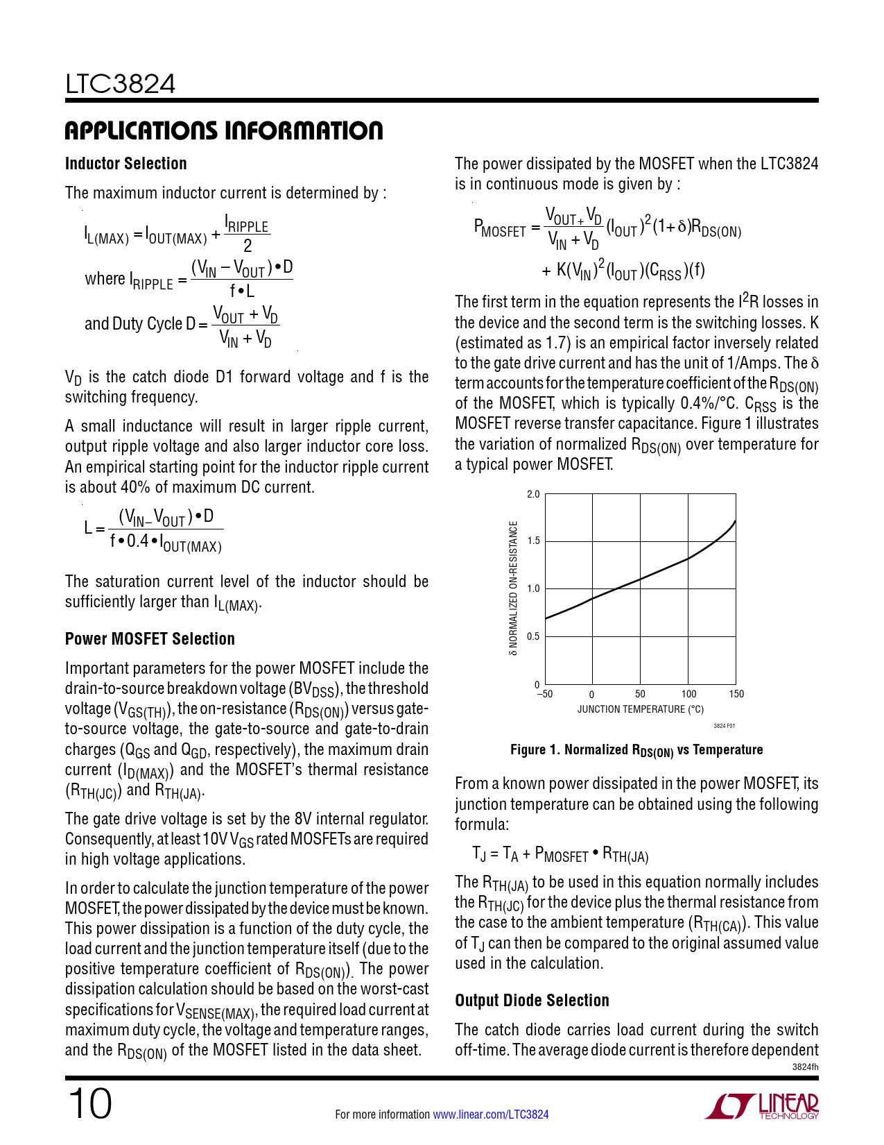 LTC3824 applicaTions inForMaTionInductor Selection The power dissipated by the MOSFET when the LTC3824 The maximum inductor current is determined by : is in continuous mode is given by : I VOUT V + D I RIPPLE P (I L(MAX) = IOUT(MAX) + MOSFET = OUT )2(1+ δ)RDS(ON) 2 VIN + VD (V where I IN – VOUT ) • D + K(VIN)2(IOUT)(CRSS)(f) RIPPLE = f •L V The first term in the equation represents the I2R losses in and Duty Cycle D= OUT + VD the device and the second term is the switching losses. K VIN + VD (estimated as 1.7) is an empirical factor inversely related to the gate drive current and has the unit of 1/Amps. The δ VD is the catch diode D1 forward voltage and f is the term accounts for the temperature coefficient of the R switching frequency. DS(ON) of the MOSFET, which is typically 0.4%/°C. CRSS is the A small inductance will result in larger ripple current, MOSFET reverse transfer capacitance. Figure 1 illustrates output ripple voltage and also larger inductor core loss. the variation of normalized RDS(ON) over temperature for An empirical starting point for the inductor ripple current a typical power MOSFET. is about 40% of maximum DC current. 2.0 (V L = IN– VOUT ) • D f • 0.4 •I ANCE 1.5 OUT(MAX) The saturation current level of the inductor should be 1.0 sufficiently larger than IL(MAX). Power MOSFET Selection 0.5 δ NORMALIZED ON-RESIST Important parameters for the power MOSFET include the drain-to-source breakdown voltage (BVDSS), the threshold 0–50 0 50 100 150 voltage (VGS(TH)), the on-resistance (RDS(ON)) versus gate- JUNCTION TEMPERATURE (°C) to-source voltage, the gate-to-source and gate-to-drain 3824 F01 charges (QGS and QGD, respectively), the maximum drain Figure 1. Normalized RDS(ON) vs Temperature current (ID(MAX)) and the MOSFET’s thermal resistance (R From a known power dissipated in the power MOSFET, its TH(JC)) and RTH(JA). junction temperature can be obtained using the following The gate drive voltage is set by the 8V internal regulator. formula: Consequently, at least 10V VGS rated MOSFETs are required in high voltage applications. TJ = TA + PMOSFET • RTH(JA) In order to calculate the junction temperature of the power The RTH(JA) to be used in this equation normally includes MOSFET, the power dissipated by the device must be known. the RTH(JC) for the device plus the thermal resistance from This power dissipation is a function of the duty cycle, the the case to the ambient temperature (RTH(CA)). This value load current and the junction temperature itself (due to the of TJ can then be compared to the original assumed value positive temperature coefficient of R used in the calculation. DS(ON)). The power dissipation calculation should be based on the worst-cast specifications for V Output Diode Selection SENSE(MAX), the required load current at maximum duty cycle, the voltage and temperature ranges, The catch diode carries load current during the switch and the RDS(ON) of the MOSFET listed in the data sheet. off-time. The average diode current is therefore dependent 3824fh 10 For more information www.linear.com/LTC3824 Document Outline Features Description Applications Typical Application Absolute Maximum Ratings Pin Configuration Electrical Characteristics Typical Performance Characteristics Applications Information Typical Application Related Parts