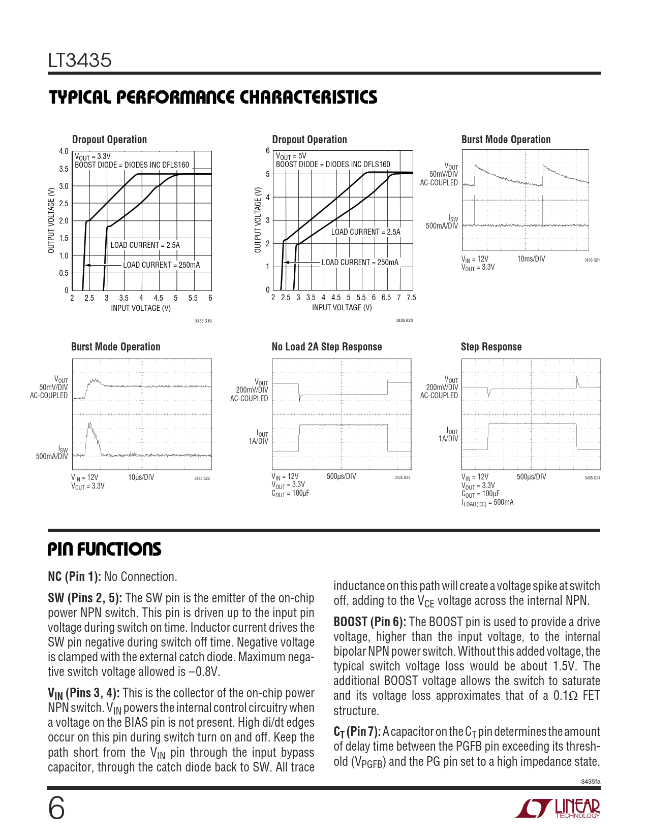 LT3435 WUTYPICAL PERFOR A CE CHARACTERISTICSDropout OperationDropout OperationBurst Mode Operation 4.0 6 VOUT = 3.3V VOUT = 5V BOOST DIODE = DIODES INC DFLS160 BOOST DIODE = DIODES INC DFLS160 3.5 VOUT 5 50mV/DIV AC-COUPLED 3.0 4 2.5 I 2.0 3 SW 500mA/DIV LOAD CURRENT = 2.5A 1.5 LOAD CURRENT = 2.5A 2 OUTPUT VOLTAGE (V) OUTPUT VOLTAGE (V) 1.0 VIN = 12V 10ms/DIV 3435 G21 LOAD CURRENT = 250mA LOAD CURRENT = 250mA 1 VOUT = 3.3V 0.5 0 0 2 2.5 3 3.5 4 4.5 5 5.5 6 2 2.5 3 3.5 4 4.5 5 5.5 6 6.5 7 7.5 INPUT VOLTAGE (V) INPUT VOLTAGE (V) 3435 G19 3435 G20 Burst Mode OperationNo Load 2A Step ResponseStep Response VOUT V V OUT OUT 50mV/DIV 200mV/DIV 200mV/DIV AC-COUPLED AC-COUPLED AC-COUPLED I I OUT OUT 1A/DIV 1A/DIV ISW 500mA/DIV V VIN = 12V 500µs/DIV 3435 G23 V IN = 12V 10µs/DIV 3435 G22 IN = 12V 500µs/DIV 3435 G24 V V OUT = 3.3V OUT = 3.3V VOUT = 3.3V COUT = 100µF COUT = 100µF ILOAD(DC) = 500mA UUUPI FU CTIO SNC (Pin 1): No Connection. inductance on this path will create a voltage spike at switch SW (Pins 2, 5): The SW pin is the emitter of the on-chip off, adding to the VCE voltage across the internal NPN. power NPN switch. This pin is driven up to the input pin voltage during switch on time. Inductor current drives the BOOST (Pin 6): The BOOST pin is used to provide a drive SW pin negative during switch off time. Negative voltage voltage, higher than the input voltage, to the internal is clamped with the external catch diode. Maximum nega- bipolar NPN power switch. Without this added voltage, the tive switch voltage allowed is –0.8V. typical switch voltage loss would be about 1.5V. The additional BOOST voltage allows the switch to saturate VIN (Pins 3, 4): This is the collector of the on-chip power and its voltage loss approximates that of a 0.1Ω FET NPN switch. VIN powers the internal control circuitry when structure. a voltage on the BIAS pin is not present. High di/dt edges occur on this pin during switch turn on and off. Keep the CT (Pin 7): A capacitor on the CT pin determines the amount path short from the V of delay time between the PGFB pin exceeding its thresh- IN pin through the input bypass capacitor, through the catch diode back to SW. All trace old (VPGFB) and the PG pin set to a high impedance state. 3435fa 6