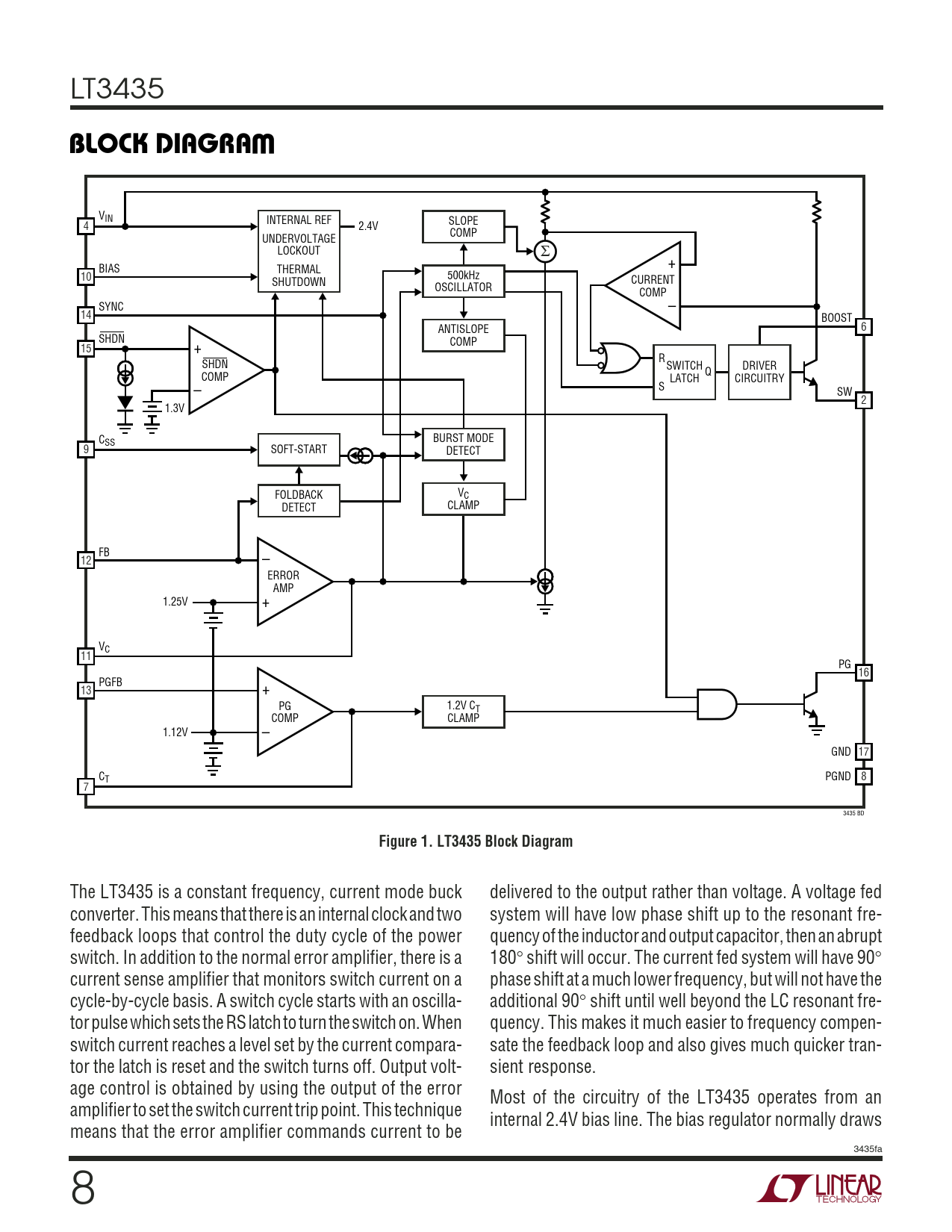 LT3435 WBLOCK DIAGRA VIN INTERNAL REF SLOPE 4 2.4V COMP UNDERVOLTAGE LOCKOUT Σ + BIAS THERMAL 10 500kHz SHUTDOWN CURRENT OSCILLATOR COMP SYNC – 14 BOOST ANTISLOPE 6 SHDN COMP 15 + R SHDN SWITCH DRIVER COMP Q LATCH CIRCUITRY – S SW 2 1.3V CSS BURST MODE 9 SOFT-START DETECT FOLDBACK VC DETECT CLAMP FB 12 – ERROR AMP 1.25V + VC 11 PG 16 PGFB 13 + PG 1.2V CT COMP CLAMP 1.12V – GND 17 CT PGND 8 7 3435 BD Figure 1. LT3435 Block Diagram The LT3435 is a constant frequency, current mode buck delivered to the output rather than voltage. A voltage fed converter. This means that there is an internal clock and two system will have low phase shift up to the resonant fre- feedback loops that control the duty cycle of the power quency of the inductor and output capacitor, then an abrupt switch. In addition to the normal error amplifier, there is a 180° shift will occur. The current fed system will have 90° current sense amplifier that monitors switch current on a phase shift at a much lower frequency, but will not have the cycle-by-cycle basis. A switch cycle starts with an oscilla- additional 90° shift until well beyond the LC resonant fre- tor pulse which sets the RS latch to turn the switch on. When quency. This makes it much easier to frequency compen- switch current reaches a level set by the current compara- sate the feedback loop and also gives much quicker tran- tor the latch is reset and the switch turns off. Output volt- sient response. age control is obtained by using the output of the error Most of the circuitry of the LT3435 operates from an amplifier to set the switch current trip point. This technique internal 2.4V bias line. The bias regulator normally draws means that the error amplifier commands current to be 3435fa 8