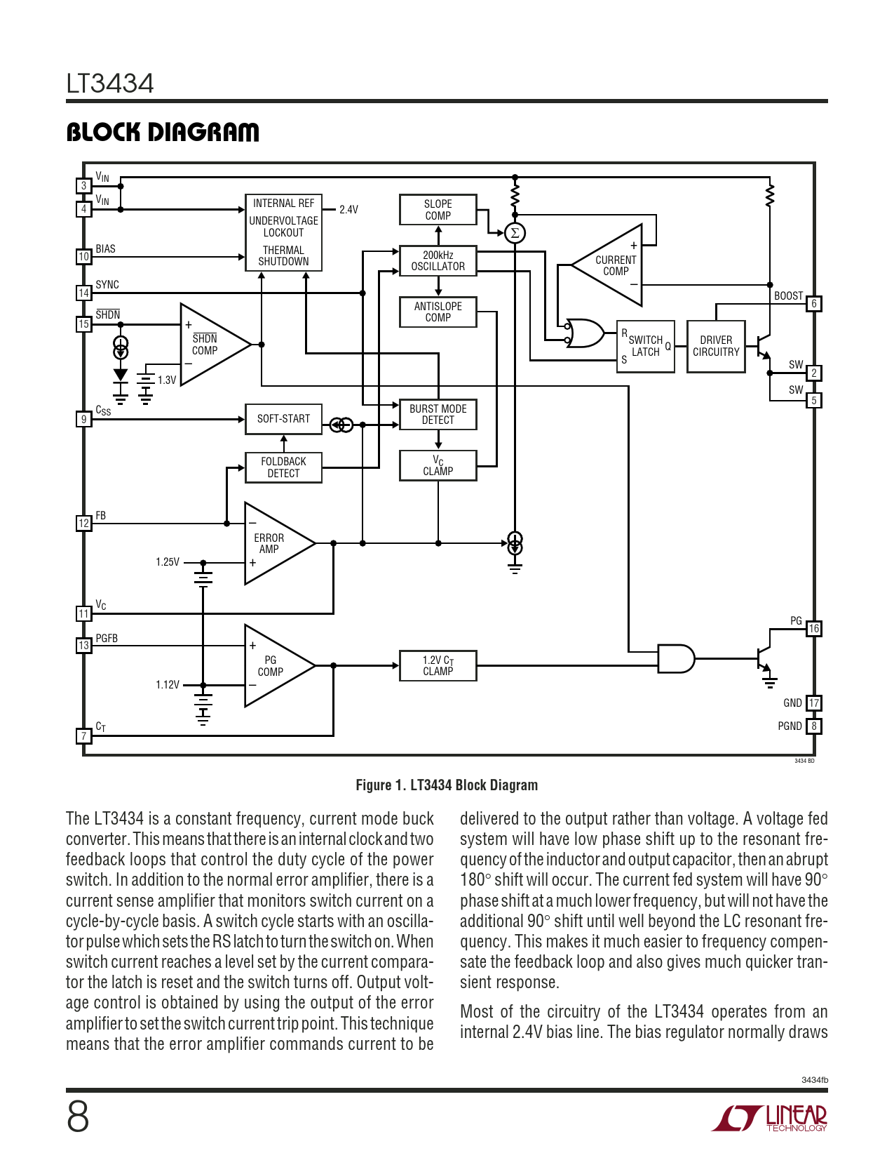 LT3434 WBLOCK DIAGRA VIN 3 VIN INTERNAL REF SLOPE 4 2.4V COMP UNDERVOLTAGE LOCKOUT Σ + BIAS THERMAL 10 200kHz SHUTDOWN CURRENT OSCILLATOR COMP SYNC – 14 BOOST ANTISLOPE 6 SHDN COMP 15 + R SHDN SWITCH DRIVER COMP Q LATCH CIRCUITRY – S SW 2 1.3V SW 5 CSS BURST MODE 9 SOFT-START DETECT FOLDBACK VC DETECT CLAMP FB 12 – ERROR AMP 1.25V + VC 11 PG 16 PGFB 13 + PG 1.2V CT COMP CLAMP 1.12V – GND 17 CT PGND 8 7 3434 BD Figure 1. LT3434 Block Diagram The LT3434 is a constant frequency, current mode buck delivered to the output rather than voltage. A voltage fed converter. This means that there is an internal clock and two system will have low phase shift up to the resonant fre- feedback loops that control the duty cycle of the power quency of the inductor and output capacitor, then an abrupt switch. In addition to the normal error amplifier, there is a 180° shift will occur. The current fed system will have 90° current sense amplifier that monitors switch current on a phase shift at a much lower frequency, but will not have the cycle-by-cycle basis. A switch cycle starts with an oscilla- additional 90° shift until well beyond the LC resonant fre- tor pulse which sets the RS latch to turn the switch on. When quency. This makes it much easier to frequency compen- switch current reaches a level set by the current compara- sate the feedback loop and also gives much quicker tran- tor the latch is reset and the switch turns off. Output volt- sient response. age control is obtained by using the output of the error Most of the circuitry of the LT3434 operates from an amplifier to set the switch current trip point. This technique internal 2.4V bias line. The bias regulator normally draws means that the error amplifier commands current to be 3434fb 8