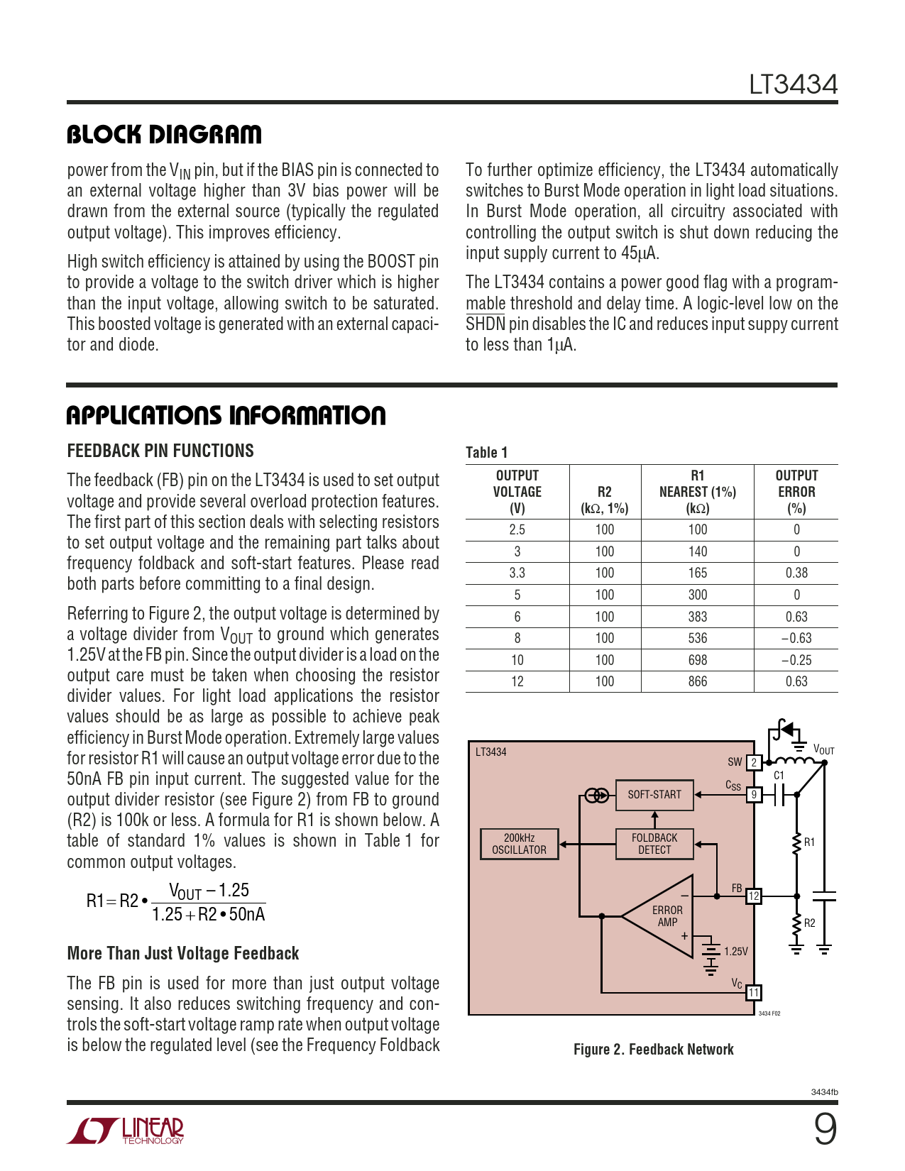 LT3434 WBLOCK DIAGRA power from the VIN pin, but if the BIAS pin is connected to To further optimize efficiency, the LT3434 automatically an external voltage higher than 3V bias power will be switches to Burst Mode operation in light load situations. drawn from the external source (typically the regulated In Burst Mode operation, all circuitry associated with output voltage). This improves efficiency. controlling the output switch is shut down reducing the input supply current to 45µA. High switch efficiency is attained by using the BOOST pin to provide a voltage to the switch driver which is higher The LT3434 contains a power good flag with a program- than the input voltage, allowing switch to be saturated. mable threshold and delay time. A logic-level low on the This boosted voltage is generated with an external capaci- SHDN pin disables the IC and reduces input suppy current tor and diode. to less than 1µA. UUWUAPPLICATIO S I FOR ATIOFEEDBACK PIN FUNCTIONSTable 1 The feedback (FB) pin on the LT3434 is used to set output OUTPUTR1OUTPUTVOLTAGER2NEAREST (1%)ERROR voltage and provide several overload protection features. (V)(k Ω , 1%)(k Ω )(%) The first part of this section deals with selecting resistors 2.5 100 100 0 to set output voltage and the remaining part talks about 3 100 140 0 frequency foldback and soft-start features. Please read 3.3 100 165 0.38 both parts before committing to a final design. 5 100 300 0 Referring to Figure 2, the output voltage is determined by 6 100 383 0.63 a voltage divider from VOUT to ground which generates 8 100 536 – 0.63 1.25V at the FB pin. Since the output divider is a load on the 10 100 698 – 0.25 output care must be taken when choosing the resistor 12 100 866 0.63 divider values. For light load applications the resistor values should be as large as possible to achieve peak efficiency in Burst Mode operation. Extremely large values V for resistor R1 will cause an output voltage error due to the OUT LT3434 SW 2 50nA FB pin input current. The suggested value for the C1 CSS output divider resistor (see Figure 2) from FB to ground SOFT-START 9 (R2) is 100k or less. A formula for R1 is shown below. A table of standard 1% values is shown in Table 1 for 200kHz FOLDBACK R1 OSCILLATOR DETECT common output voltages. V – 1 2 . 5 FB R = R OUT 1 2 • – 12 1 2 . 5 + R2 • 5 n 0 A ERROR AMP R2 + More Than Just Voltage Feedback 1.25V The FB pin is used for more than just output voltage VC 11 sensing. It also reduces switching frequency and con- 3434 F02 trols the soft-start voltage ramp rate when output voltage is below the regulated level (see the Frequency Foldback Figure 2. Feedback Network 3434fb 9