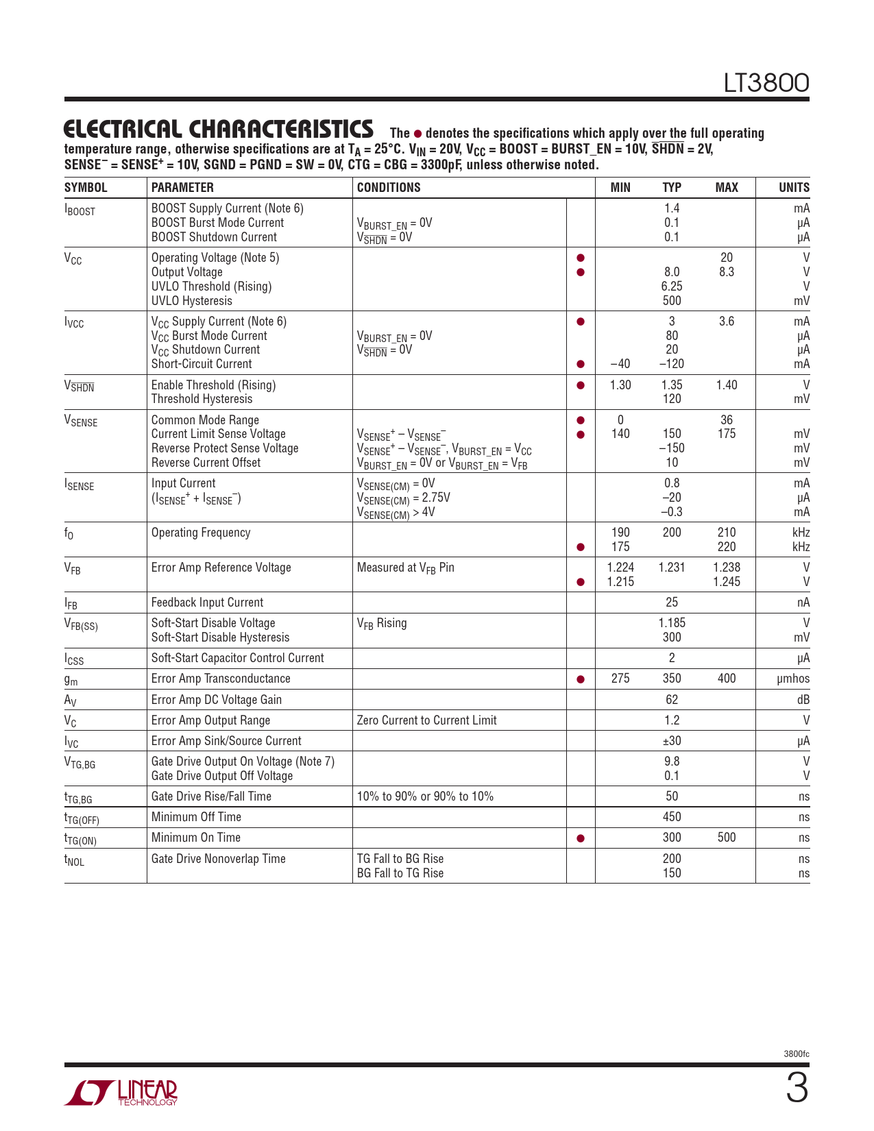 LT3800 ELECTRICAL CHARACTERISTICSThe l denotes the specifi cations which apply over the full operatingtemperature range, otherwise specifi cations are at TA = 25°C. VIN = 20V, VCC = BOOST = BURST_EN = 10V, SHDN = 2V,SENSE– = SENSE+ = 10V, SGND = PGND = SW = 0V, CTG = CBG = 3300pF, unless otherwise noted.SYMBOLPARAMETERCONDITIONSMINTYPMAXUNITS IBOOST BOOST Supply Current (Note 6) 1.4 mA BOOST Burst Mode Current VBURST_EN = 0V 0.1 μA BOOST Shutdown Current VSHDN = 0V 0.1 μA VCC Operating Voltage (Note 5) ● 20 V Output Voltage ● 8.0 8.3 V UVLO Threshold (Rising) 6.25 V UVLO Hysteresis 500 mV IVCC VCC Supply Current (Note 6) ● 3 3.6 mA VCC Burst Mode Current VBURST_EN = 0V 80 μA VCC Shutdown Current VSHDN = 0V 20 μA Short-Circuit Current ● –40 –120 mA VSHDN Enable Threshold (Rising) ● 1.30 1.35 1.40 V Threshold Hysteresis 120 mV VSENSE Common Mode Range ● 0 36 Current Limit Sense Voltage V + – SENSE – VSENSE ● 140 150 175 mV Reverse Protect Sense Voltage V + – SENSE – VSENSE , VBURST_EN = VCC –150 mV Reverse Current Offset VBURST_EN = 0V or VBURST_EN = VFB 10 mV ISENSE Input Current VSENSE(CM) = 0V 0.8 mA (I + – SENSE + ISENSE ) VSENSE(CM) = 2.75V –20 μA VSENSE(CM) > 4V –0.3 mA fO Operating Frequency 190 200 210 kHz ● 175 220 kHz VFB Error Amp Reference Voltage Measured at VFB Pin 1.224 1.231 1.238 V ● 1.215 1.245 V IFB Feedback Input Current 25 nA VFB(SS) Soft-Start Disable Voltage VFB Rising 1.185 V Soft-Start Disable Hysteresis 300 mV ICSS Soft-Start Capacitor Control Current 2 μA gm Error Amp Transconductance ● 275 350 400 μmhos AV Error Amp DC Voltage Gain 62 dB VC Error Amp Output Range Zero Current to Current Limit 1.2 V IVC Error Amp Sink/Source Current ±30 μA VTG,BG Gate Drive Output On Voltage (Note 7) 9.8 V Gate Drive Output Off Voltage 0.1 V tTG,BG Gate Drive Rise/Fall Time 10% to 90% or 90% to 10% 50 ns tTG(OFF) Minimum Off Time 450 ns tTG(ON) Minimum On Time ● 300 500 ns tNOL Gate Drive Nonoverlap Time TG Fall to BG Rise 200 ns BG Fall to TG Rise 150 ns 3800fc 3 Document Outline FEATURES DESCRIPTION APPLICATIONS TYPICAL APPLICATION ABSOLUTE MAXIMUM RATINGS PIN CONFIGURATION ORDER INFORMATION ELECTRICAL CHARACTERISTICS TYPICAL PERFORMANCE CHARACTERISTICS PIN FUNCTIONS FUNCTIONAL DIAGRAM APPLICATIONS INFORMATION TYPICAL APPLICATIONS PACKAGE DESCRIPTION REVISION HISTORY TYPICAL APPLICATION RELATED PARTS