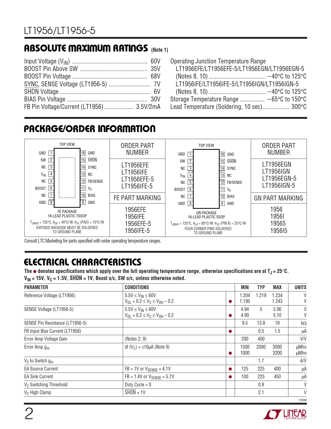 Input Voltage (VIN) ... 60V Operating Junction Temperature Range BOOST Pin Above SW .. 35V LT1956EFE/LT1956EFE-5/LT1956EGN/LT1956EGN-5 BOOST Pin Voltage ... 68V (Notes 8, 10) ... – 40°C to 125°C SYNC, SENSE Voltage (LT1956-5) ... 7V LT1956IFE/LT1956IFE-5/LT1956IGN/LT1956IGN-5 SHDN Voltage ... 6V (Notes 8, 10) ... – 40°C to 125°C BIAS Pin Voltage .. 30V Storage Temperature Range .. – 65°C to 150°C FB Pin Voltage/Current (LT1956) ... 3.5V/2mA Lead Temperature (Soldering, 10 sec)... 300°C