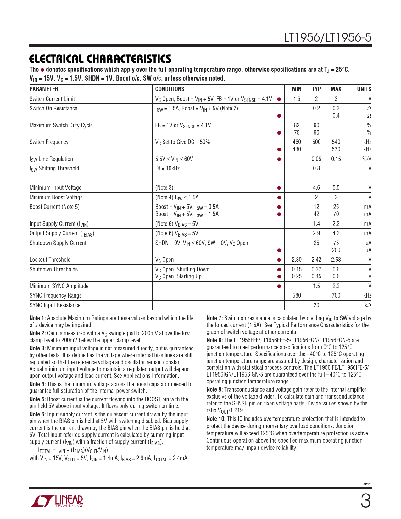 Switch Current Limit VC Open, Boost = VIN + 5V, FB = 1V or VSENSE = 4.1V ● 1.5 2 3 A Switch On Resistance ISW = 1.5A, Boost = VIN + 5V (Note 7) 0.2 0.3 Ω ● 0.4 Ω Maximum Switch Duty Cycle FB = 1V or VSENSE = 4.1V 82 90 % ● 75 90 % Switch Frequency VC Set to Give DC = 50% 460 500 540 kHz ● 430 570 kHz fSW Line Regulation 5.5V ≤ VIN ≤ 60V ● 0.05 0.15 %/V fSW Shifting Threshold Df = 10kHz 0.8 V Minimum Input Voltage (Note 3) ● 4.6 5.5 V Minimum Boost Voltage (Note 4) ISW ≤ 1.5A ● 2 3 V Boost Current (Note 5) Boost = VIN + 5V, ISW = 0.5A ● 12 25 mA Boost = VIN + 5V, ISW = 1.5A ● 42 70 mA Input Supply Current (IVIN) (Note 6) VBIAS = 5V 1.4 2.2 mA Output Supply Current (IBIAS) (Note 6) VBIAS = 5V 2.9 4.2 mA Shutdown Supply Current SHDN = 0V, VIN ≤ 60V, SW = 0V, VC Open 25 75 µA ● 200 µA Lockout Threshold VC Open ● 2.30 2.42 2.53 V Shutdown Thresholds VC Open, Shutting Down ● 0.15 0.37 0.6 V VC Open, Starting Up ● 0.25 0.45 0.6 V Minimum SYNC Amplitude ● 1.5 2.2 V SYNC Frequency Range 580 700 kHz SYNC Input Resistance 20 kΩ