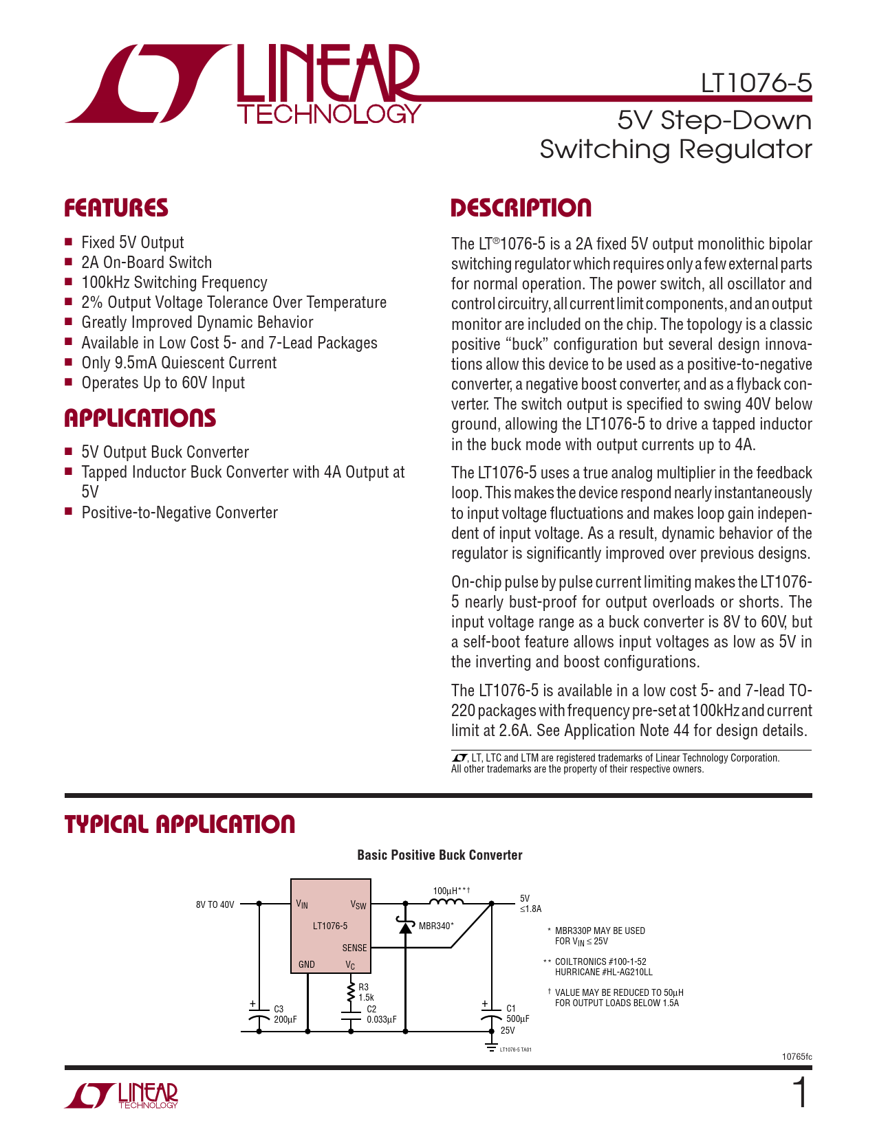 LT1076-5 5V Step-Down Switching Regulator FEATURESDESCRIPTION n Fixed 5V Output The LT®1076-5 is a 2A fi xed 5V output monolithic bipolar n 2A On-Board Switch switching regulator which requires only a few external parts n 100kHz Switching Frequency for normal operation. The power switch, all oscillator and n 2% Output Voltage Tolerance Over Temperature control circuitry, all current limit components, and an output n Greatly Improved Dynamic Behavior monitor are included on the chip. The topology is a classic n Available in Low Cost 5- and 7-Lead Packages positive “buck” confi guration but several design innova- n Only 9.5mA Quiescent Current tions allow this device to be used as a positive-to-negative n Operates Up to 60V Input converter, a negative boost converter, and as a fl yback con- verter. The switch output is specifi ed to swing 40V below APPLICATIONS ground, allowing the LT1076-5 to drive a tapped inductor in the buck mode with output currents up to 4A. n 5V Output Buck Converter n Tapped Inductor Buck Converter with 4A Output at The LT1076-5 uses a true analog multiplier in the feedback 5V loop. This makes the device respond nearly instantaneously n Positive-to-Negative Converter to input voltage fl uctuations and makes loop gain indepen- dent of input voltage. As a result, dynamic behavior of the regulator is signifi cantly improved over previous designs. On-chip pulse by pulse current limiting makes the LT1076- 5 nearly bust-proof for output overloads or shorts. The input voltage range as a buck converter is 8V to 60V, but a self-boot feature allows input voltages as low as 5V in the inverting and boost confi gurations. The LT1076-5 is available in a low cost 5- and 7-lead TO- 220 packages with frequency pre-set at 100kHz and current limit at 2.6A. See Application Note 44 for design details. , LT, LTC and LTM are registered trademarks of Linear Technology Corporation. All other trademarks are the property of their respective owners. TYPICAL APPLICATIONBasic Positive Buck Converter 100μH**† 5V 8V TO 40V VIN VSW ≤1.8A LT1076-5 MBR340* * MBR330P MAY BE USED FOR VIN ≤ 25V SENSE GND V ** COILTRONICS #100-1-52 C HURRICANE #HL-AG210LL R3 † VALUE MAY BE REDUCED TO 50μH 1.5k + + FOR OUTPUT LOADS BELOW 1.5A C3 C2 C1 200μF 0.033μF 500μF 25V LT1076-5 TA01 10765fc 1