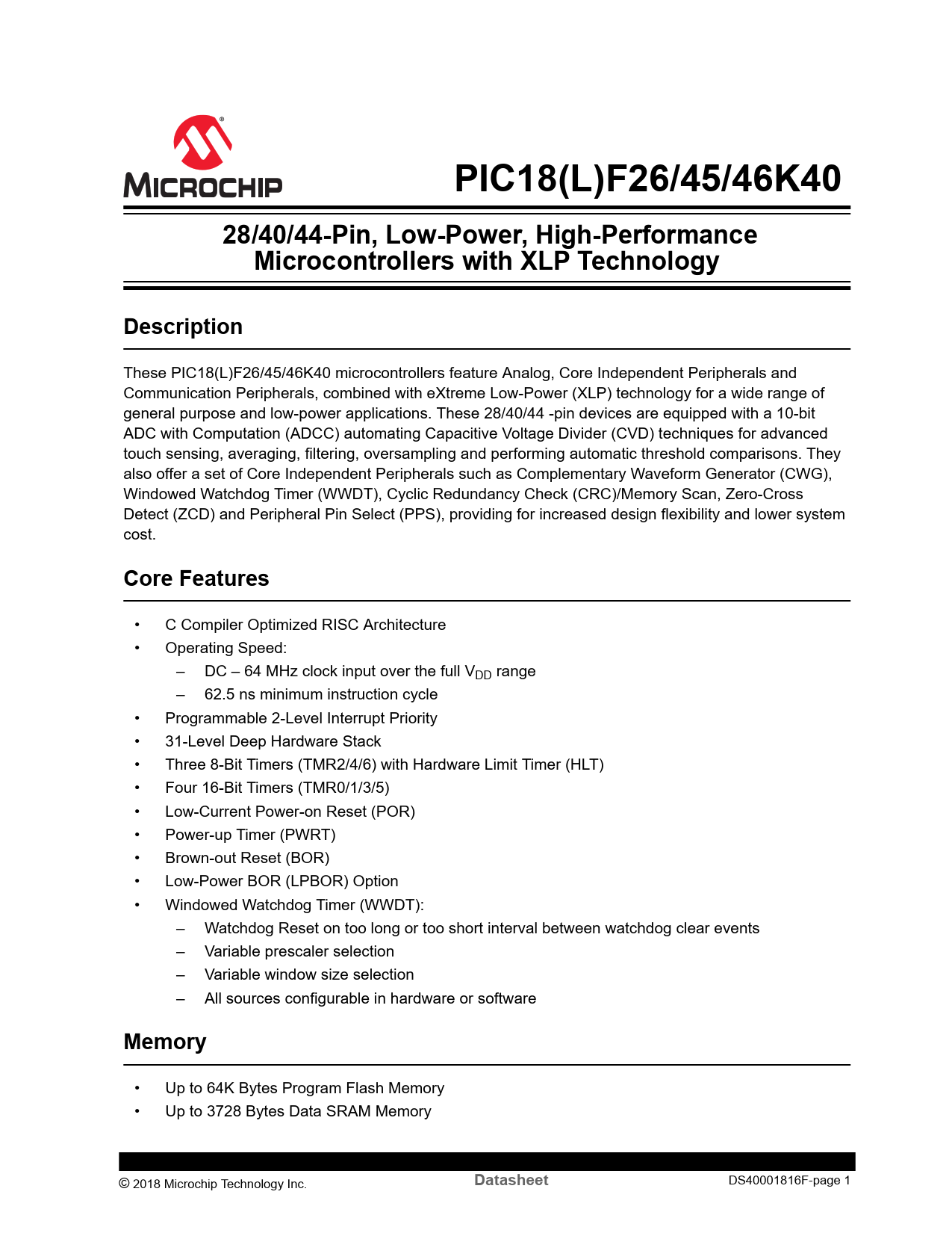 | 页数 / 页 | 822 / 1 — PIC18(L)F26/45/46K40. 28/40/44-Pin, Low-Power, High-Performance. … |