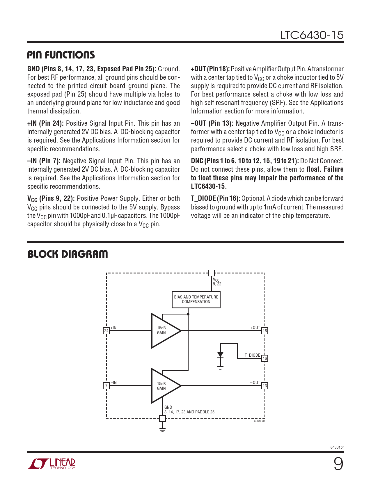VCC 9, 22 BIAS AND TEMPERATURE COMPENSATION +IN 15dB +OUT 24 GAIN 18 T_DIODE 16 –IN 15dB –OUT 7 13 GAIN GND 8, 14, 17, 23 AND PADDLE 25 643015 BD 643015f 9 Document Outline Features Applications Description Typical Application Absolute Maximum Ratings Pin Configuration Order Information DC Electrical Characteristics AC Electrical Characteristics Typical Performance Characteristics Pin Functions Block Diagram Test Circuit A Operation Applications Information Differential S Parameters Typical Applications Package Description Typical Application Related Parts