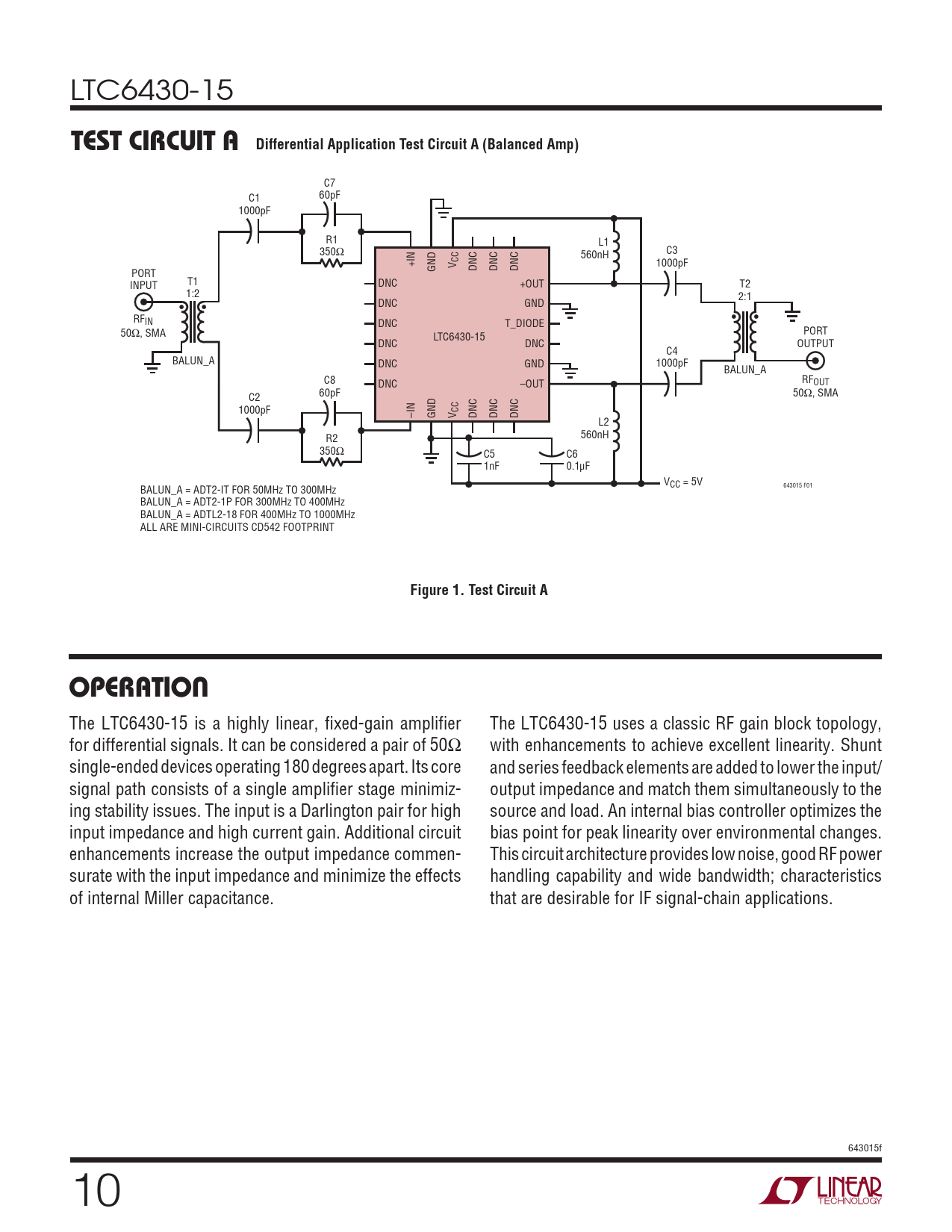 LTC6430-15 TesT circuiT a Differential Application Test Circuit A (Balanced Amp) C7 C1 60pF 1000pF R1 L1 350Ω 560nH C3 +IN 1000pF PORT GND V CC DNC DNC DNC T1 INPUT DNC +OUT T2 1:2 2:1 DNC GND RFIN DNC T_DIODE • • 50Ω, SMA PORT LTC6430-15 DNC DNC OUTPUT C4 BALUN_A DNC GND 1000pF BALUN_A C8 RF DNC OUT –OUT 60pF 50Ω, SMA C2 1000pF –IN GND V CC DNC DNC DNC L2 R2 560nH 350Ω C5 C6 1nF 0.1µF VCC = 5V 643015 F01 BALUN_A = ADT2-IT FOR 50MHz TO 300MHz BALUN_A = ADT2-1P FOR 300MHz TO 400MHz BALUN_A = ADTL2-18 FOR 400MHz TO 1000MHz ALL ARE MINI-CIRCUITS CD542 FOOTPRINT Figure 1. Test Circuit AoperaTion The LTC6430-15 is a highly linear, fixed-gain amplifier The LTC6430-15 uses a classic RF gain block topology, for differential signals. It can be considered a pair of 50Ω with enhancements to achieve excellent linearity. Shunt single-ended devices operating 180 degrees apart. Its core and series feedback elements are added to lower the input/ signal path consists of a single amplifier stage minimiz- output impedance and match them simultaneously to the ing stability issues. The input is a Darlington pair for high source and load. An internal bias controller optimizes the input impedance and high current gain. Additional circuit bias point for peak linearity over environmental changes. enhancements increase the output impedance commen- This circuit architecture provides low noise, good RF power surate with the input impedance and minimize the effects handling capability and wide bandwidth; characteristics of internal Miller capacitance. that are desirable for IF signal-chain applications. 643015f 10 Document Outline Features Applications Description Typical Application Absolute Maximum Ratings Pin Configuration Order Information DC Electrical Characteristics AC Electrical Characteristics Typical Performance Characteristics Pin Functions Block Diagram Test Circuit A Operation Applications Information Differential S Parameters Typical Applications Package Description Typical Application Related Parts