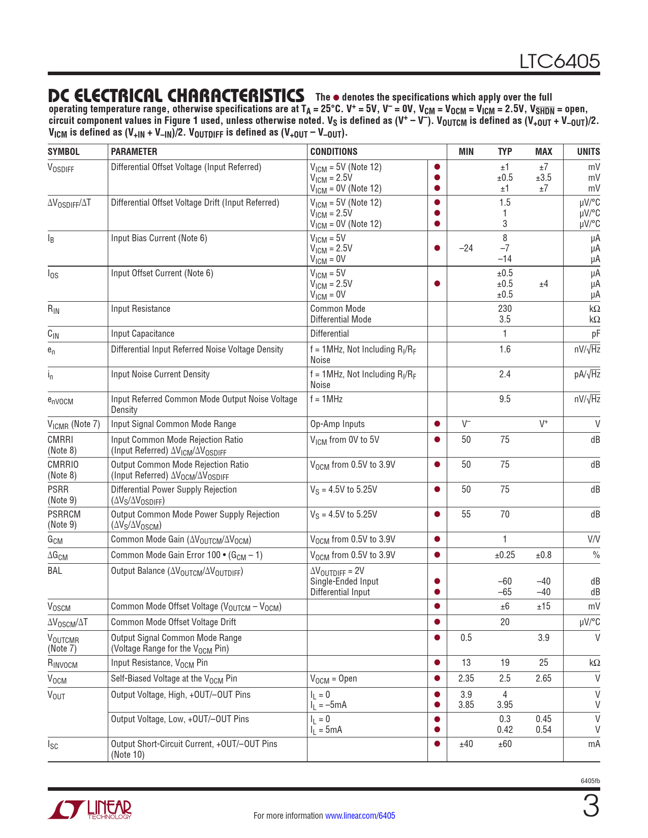 VOSDIFF Differential Offset Voltage (Input Referred) VICM = 5V (Note 12) l ±1 ±7 mV VICM = 2.5V l ±0.5 ±3.5 mV VICM = 0V (Note 12) l ±1 ±7 mV ∆VOSDIFF/∆T Differential Offset Voltage Drift (Input Referred) VICM = 5V (Note 12) l 1.5 µV/°C VICM = 2.5V l 1 µV/°C VICM = 0V (Note 12) l 3 µV/°C IB Input Bias Current (Note 6) VICM = 5V 8 µA VICM = 2.5V l –24 –7 µA VICM = 0V –14 µA IOS Input Offset Current (Note 6) VICM = 5V ±0.5 µA VICM = 2.5V l ±0.5 ±4 µA VICM = 0V ±0.5 µA RIN Input Resistance Common Mode 230 kΩ Differential Mode 3.5 kΩ CIN Input Capacitance Differential 1 pF en Differential Input Referred Noise Voltage Density f = 1MHz, Not Including RI/RF 1.6 nV/√Hz Noise in Input Noise Current Density f = 1MHz, Not Including RI/RF 2.4 pA/√Hz Noise enVOCM Input Referred Common Mode Output Noise Voltage f = 1MHz 9.5 nV/√Hz Density VICMR (Note 7) Input Signal Common Mode Range Op-Amp Inputs l V– V+ V CMRRI Input Common Mode Rejection Ratio VICM from 0V to 5V l 50 75 dB (Note 8) (Input Referred) ∆VICM/∆VOSDIFF CMRRIO Output Common Mode Rejection Ratio VOCM from 0.5V to 3.9V l 50 75 dB (Note 8) (Input Referred) ∆VOCM/∆VOSDIFF PSRR Differential Power Supply Rejection VS = 4.5V to 5.25V l 50 75 dB (Note 9) (∆VS/∆VOSDIFF) PSRRCM Output Common Mode Power Supply Rejection VS = 4.5V to 5.25V l 55 70 dB (Note 9) (∆VS/∆VOSCM) GCM Common Mode Gain (∆VOUTCM/∆VOCM) VOCM from 0.5V to 3.9V l 1 V/V ∆GCM Common Mode Gain Error 100 • (GCM – 1) VOCM from 0.5V to 3.9V l ±0.25 ±0.8 % BAL Output Balance (∆VOUTCM/∆VOUTDIFF) ∆VOUTDIFF = 2V Single-Ended Input l –60 –40 dB Differential Input l –65 –40 dB VOSCM Common Mode Offset Voltage (VOUTCM – VOCM) l ±6 ±15 mV ∆VOSCM/∆T Common Mode Offset Voltage Drift l 20 µV/°C VOUTCMR Output Signal Common Mode Range l 0.5 3.9 V (Note 7) (Voltage Range for the VOCM Pin) RINVOCM Input Resistance, VOCM Pin l 13 19 25 kΩ VOCM Self-Biased Voltage at the VOCM Pin VOCM = Open l 2.35 2.5 2.65 V VOUT Output Voltage, High, +OUT/–OUT Pins IL = 0 l 3.9 4 V IL = –5mA l 3.85 3.95 V Output Voltage, Low, +OUT/–OUT Pins IL = 0 l 0.3 0.45 V IL = 5mA l 0.42 0.54 V ISC Output Short-Circuit Current, +OUT/–OUT Pins l ±40 ±60 mA (Note 10) 6405fb For more information www.linear.com/6405 3
