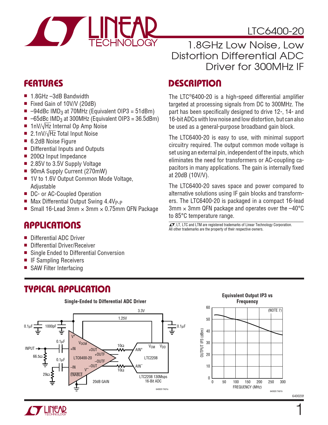 LTC6400-20 1.8GHz Low Noise, Low Distortion Differential ADC Driver for 300MHz IF FEATURESDESCRIPTION ■ 1.8GHz –3dB Bandwidth The LTC®6400-20 is a high-speed differential amplifi er ■ Fixed Gain of 10V/V (20dB) targeted at processing signals from DC to 300MHz. The ■ –94dBc IMD3 at 70MHz (Equivalent OIP3 = 51dBm) part has been specifi cally designed to drive 12-, 14- and ■ –65dBc IMD3 at 300MHz (Equivalent OIP3 = 36.5dBm) 16-bit ADCs with low noise and low distortion, but can also ■ 1nV/√Hz Internal Op Amp Noise be used as a general-purpose broadband gain block. ■ 2.1nV/√Hz Total Input Noise The LTC6400-20 is easy to use, with minimal support ■ 6.2dB Noise Figure circuitry required. The output common mode voltage is ■ Differential Inputs and Outputs set using an external pin, independent of the inputs, which ■ 200Ω Input Impedance eliminates the need for transformers or AC-coupling ca- ■ 2.85V to 3.5V Supply Voltage pacitors in many applications. The gain is internally fi xed ■ 90mA Supply Current (270mW) at 20dB (10V/V). ■ 1V to 1.6V Output Common Mode Voltage, Adjustable The LTC6400-20 saves space and power compared to ■ DC- or AC-Coupled Operation alternative solutions using IF gain blocks and transform- ■ Max Differential Output Swing 4.4V ers. The LTC6400-20 is packaged in a compact 16-lead P-P ■ Small 16-Lead 3mm × 3mm × 0.75mm QFN Package 3mm × 3mm QFN package and operates over the –40°C to 85°C temperature range. APPLICATIONS , LT, LTC and LTM are registered trademarks of Linear Technology Corporation. All other trademarks are the property of their respective owners. ■ Differential ADC Driver ■ Differential Driver/Receiver ■ Single Ended to Differential Conversion ■ IF Sampling Receivers ■ SAW Filter Interfacing TYPICAL APPLICATIONEquivalent Output IP3 vsSingle-Ended to Differential ADC DriverFrequency 60 3.3V (NOTE 7) 1.25V 50 0.1μF 1000pF 0.1μF 40 V+ 0.1μF VOCM 30 10Ω V INPUT +IN CM VDD +OUT AIN+ +OUTF 20 66.5Ω OUTPUT IP3 (dBm) LTC6400-20 LTC2208 0.1μF –OUTF –IN –OUT AIN– 10 V– 10Ω 29Ω ENABLE LTC2208 130Msps 0 20dB GAIN 16-Bit ADC 0 50 100 150 200 250 300 FREQUENCY (MHz) 640020 TA01a 640020 TA01b 640020f 1