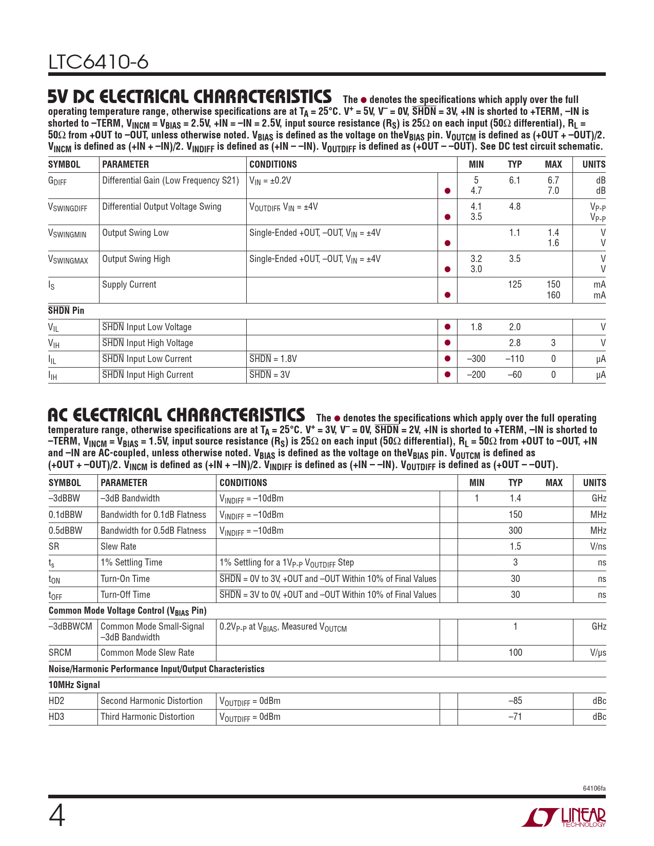 LTC6410-6 The5V DC ELECTRICAL CHARACTERISTICS l denotes the specifi cations which apply over the fulloperating temperature range, otherwise specifi cations are at TA = 25°C. V+ = 5V, V– = 0V, SHDN = 3V, +IN is shorted to +TERM, –IN isshorted to –TERM, VINCM = VBIAS = 2.5V, +IN = –IN = 2.5V, input source resistance (RS) is 25 Ω on each input (50 Ω differential), RL =50 Ω from +OUT to –OUT, unless otherwise noted. VBIAS is defi ned as the voltage on theVBIAS pin. VOUTCM is defi ned as (+OUT + –OUT)/2.VINCM is defi ned as (+IN + –IN)/2. VINDIFF is defi ned as (+IN – –IN). VOUTDIFF is defi ned as (+OUT – –OUT). See DC test circuit schematic.SYMBOLPARAMETERCONDITIONSMINTYPMAXUNITS GDIFF Differential Gain (Low Frequency S21) VIN = ±0.2V 5 6.1 6.7 dB l 4.7 7.0 dB VSWINGDIFF Differential Output Voltage Swing VOUTDIFF, VIN = ±4V 4.1 4.8 VP-P l 3.5 VP-P VSWINGMIN Output Swing Low Single-Ended +OUT, –OUT, VIN = ±4V 1.1 1.4 V l 1.6 V VSWINGMAX Output Swing High Single-Ended +OUT, –OUT, VIN = ±4V 3.2 3.5 V l 3.0 V IS Supply Current 125 150 mA l 160 mA SHDN Pin VIL SHDN Input Low Voltage l 1.8 2.0 V VIH SHDN Input High Voltage l 2.8 3 V IIL SHDN Input Low Current SHDN = 1.8V l –300 –110 0 μA IIH SHDN Input High Current SHDN = 3V l –200 –60 0 μA AC ELECTRICAL CHARACTERISTICSThe l denotes the specifi cations which apply over the full operatingtemperature range, otherwise specifi cations are at TA = 25°C. V+ = 3V, V– = 0V, SHDN = 2V, +IN is shorted to +TERM, –IN is shorted to–TERM, VINCM = VBIAS = 1.5V, input source resistance (RS) is 25 Ω on each input (50 Ω differential), RL = 50 Ω from +OUT to –OUT, +INand –IN are AC-coupled, unless otherwise noted. VBIAS is defi ned as the voltage on theVBIAS pin. VOUTCM is defi ned as(+OUT + –OUT)/2. VINCM is defi ned as (+IN + –IN)/2. VINDIFF is defi ned as (+IN – –IN). VOUTDIFF is defi ned as (+OUT – –OUT).SYMBOLPARAMETERCONDITIONSMINTYPMAXUNITS –3dBBW –3dB Bandwidth VINDIFF = –10dBm 1 1.4 GHz 0.1dBBW Bandwidth for 0.1dB Flatness VINDIFF = –10dBm 150 MHz 0.5dBBW Bandwidth for 0.5dB Flatness VINDIFF = –10dBm 300 MHz SR Slew Rate 1.5 V/ns ts 1% Settling Time 1% Settling for a 1VP-P VOUTDIFF Step 3 ns tON Turn-On Time SHDN = 0V to 3V, +OUT and –OUT Within 10% of Final Values 30 ns tOFF Turn-Off Time SHDN = 3V to 0V, +OUT and –OUT Within 10% of Final Values 30 ns Common Mode Voltage Control (VBIAS Pin) –3dBBWCM Common Mode Small-Signal 0.2VP-P at VBIAS, Measured VOUTCM 1 GHz –3dB Bandwidth SRCM Common Mode Slew Rate 100 V/μs Noise/Harmonic Performance Input/Output Characteristics10MHz Signal HD2 Second Harmonic Distortion VOUTDIFF = 0dBm –85 dBc HD3 Third Harmonic Distortion VOUTDIFF = 0dBm –71 dBc 64106fa 4