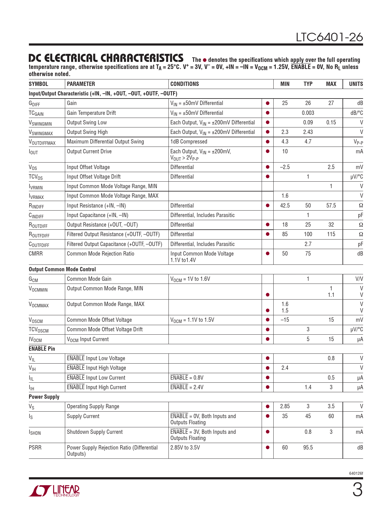 LTC6401-26 DC ELECTRICAL CHARACTERISTICSThe ● denotes the specifi cations which apply over the full operatingtemperature range, otherwise specifi cations are at TA = 25°C. V+ = 3V, V– = 0V, +IN = –IN = VOCM = 1.25V, ⎯ E ⎯ N ⎯ A ⎯ B ⎯ L ⎯ E = 0V, No RL unlessotherwise noted.SYMBOLPARAMETERCONDITIONSMINTYPMAXUNITSInput/Output Characteristic (+IN, –IN, +OUT, –OUT, +OUTF, –OUTF) GDIFF Gain VIN = ±50mV Differential ● 25 26 27 dB TCGAIN Gain Temperature Drift VIN = ±50mV Differential ● 0.003 dB/°C VSWINGMIN Output Swing Low Each Output, VIN = ±200mV Differential ● 0.09 0.15 V VSWINGMAX Output Swing High Each Output, VIN = ±200mV Differential ● 2.3 2.43 V VOUTDIFFMAX Maximum Differential Output Swing 1dB Compressed ● 4.3 4.7 VP-P IOUT Output Current Drive Each Output, VIN = ±200mV, ● 10 mA VOUT > 2VP-P VOS Input Offset Voltage Differential ● –2.5 2.5 mV TCVOS Input Offset Voltage Drift Differential ● 1 μV/°C IVRMIN Input Common Mode Voltage Range, MIN 1 V IVRMAX Input Common Mode Voltage Range, MAX 1.6 V RINDIFF Input Resistance (+IN, –IN) Differential ● 42.5 50 57.5 Ω CINDIFF Input Capacitance (+IN, –IN) Differential, Includes Parasitic 1 pF ROUTDIFF Output Resistance (+OUT, –OUT) Differential ● 18 25 32 Ω ROUTFDIFF Filtered Output Resistance (+OUTF, –OUTF) Differential ● 85 100 115 Ω COUTFDIFF Filtered Output Capacitance (+OUTF, –OUTF) Differential, Includes Parasitic 2.7 pF CMRR Common Mode Rejection Ratio Input Common Mode Voltage ● 50 75 dB 1.1V to1.4V Output Common Mode Control GCM Common Mode Gain VOCM = 1V to 1.6V 1 V/V VOCMMIN Output Common Mode Range, MIN 1 V ● 1.1 V VOCMMAX Output Common Mode Range, MAX 1.6 V ● 1.5 V VOSCM Common Mode Offset Voltage VOCM = 1.1V to 1.5V ● –15 15 mV TCVOSCM Common Mode Offset Voltage Drift ● 3 μV/°C IVOCM VOCM Input Current ● 5 15 μA ⎯ E ⎯ N ⎯ A ⎯ B ⎯ L ⎯ E Pin VIL ⎯E⎯N⎯A⎯B⎯L⎯E Input Low Voltage ● 0.8 V VIH ⎯E⎯N⎯A⎯B⎯L⎯E Input High Voltage ● 2.4 V IIL ⎯E⎯N⎯A⎯B⎯L⎯E Input Low Current ⎯E⎯N⎯A⎯B⎯L⎯E = 0.8V ● 0.5 μA IIH ⎯E⎯N⎯A⎯B⎯L⎯E Input High Current ⎯E⎯N⎯A⎯B⎯L⎯E = 2.4V ● 1.4 3 μA Power Supply VS Operating Supply Range ● 2.85 3 3.5 V IS Supply Current ⎯E⎯N⎯A⎯B⎯L⎯E = 0V, Both Inputs and ● 35 45 60 mA Outputs Floating ISHDN Shutdown Supply Current ⎯E⎯N⎯A⎯B⎯L⎯E = 3V, Both Inputs and ● 0.8 3 mA Outputs Floating PSRR Power Supply Rejection Ratio (Differential 2.85V to 3.5V ● 60 95.5 dB Outputs) 640126f 3
