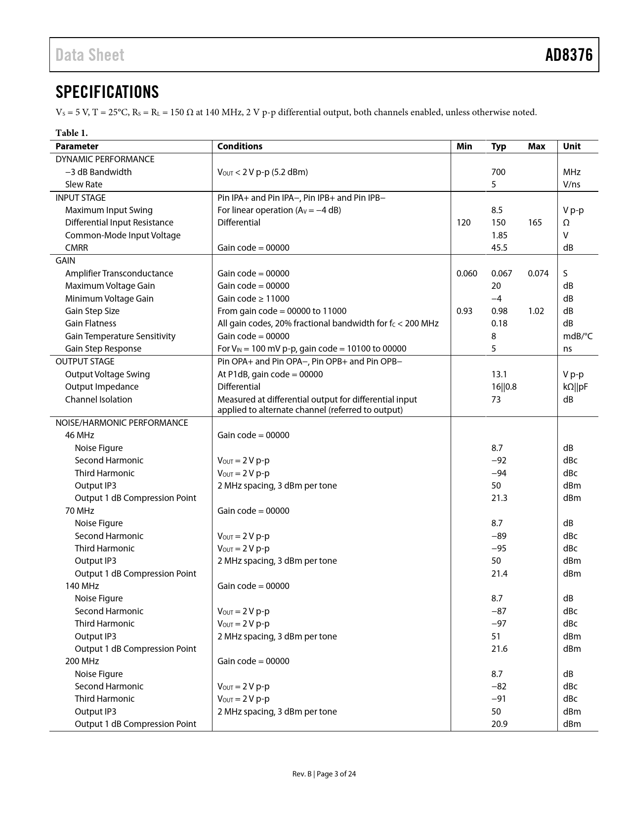 页数 / 页24 / 3 — Data Sheet. AD8376. SPECIFICATIONS. Table 1. Parameter. Conditions. Min. …