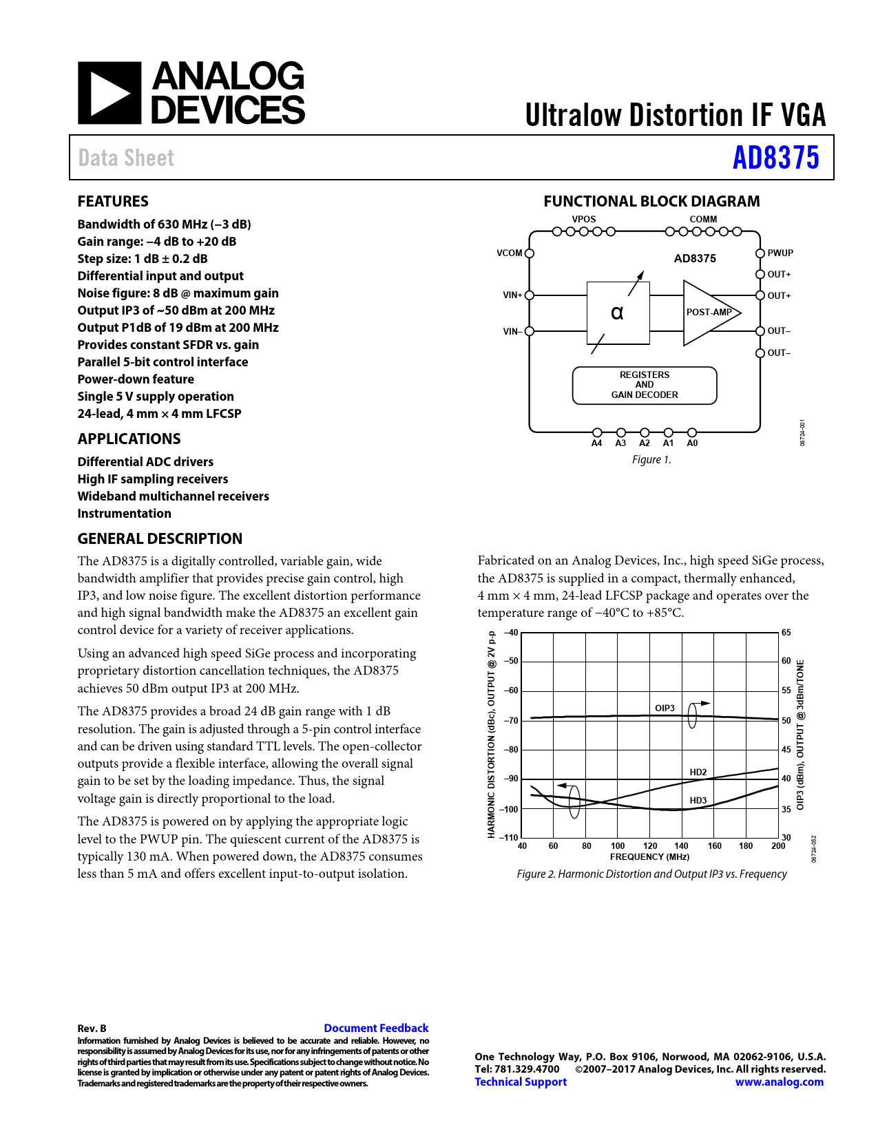 | 页数 / 页 | 24 / 1 — Ultralow Distortion IF VGA. Data Sheet. AD8375. FEATURES. FUNCTIONAL … |