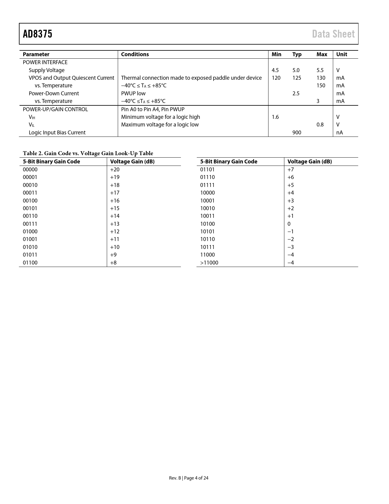 POWER INTERFACE Supply Voltage 4.5 5.0 5.5 V VPOS and Output Quiescent Current Thermal connection made to exposed paddle under device 120 125 130 mA vs. Temperature −40°C ≤ TA ≤ +85°C 150 mA Power-Down Current PWUP low 2.5 mA vs. Temperature −40°C ≤TA ≤ +85°C 3 mA POWER-UP/GAIN CONTROL Pin A0 to Pin A4, Pin PWUP VIH Minimum voltage for a logic high 1.6 V VIL Maximum voltage for a logic low 0.8 V Logic Input Bias Current 900 nA