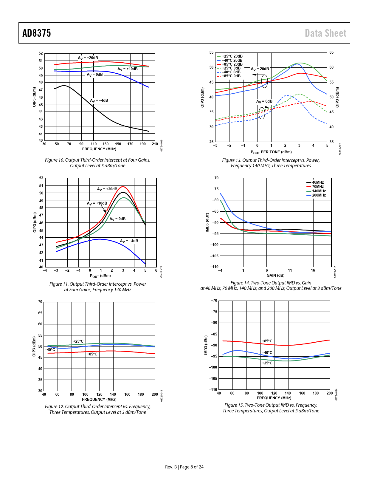 06 06 Figure 11. Output Third-Order Intercept vs. Power Figure 14. Two-Tone Output IMD vs. Gain at Four Gains, Frequency 140 MHz at 46 MHz, 70 MHz, 140 MHz, and 200 MHz, Output Level at 3 dBm/Tone