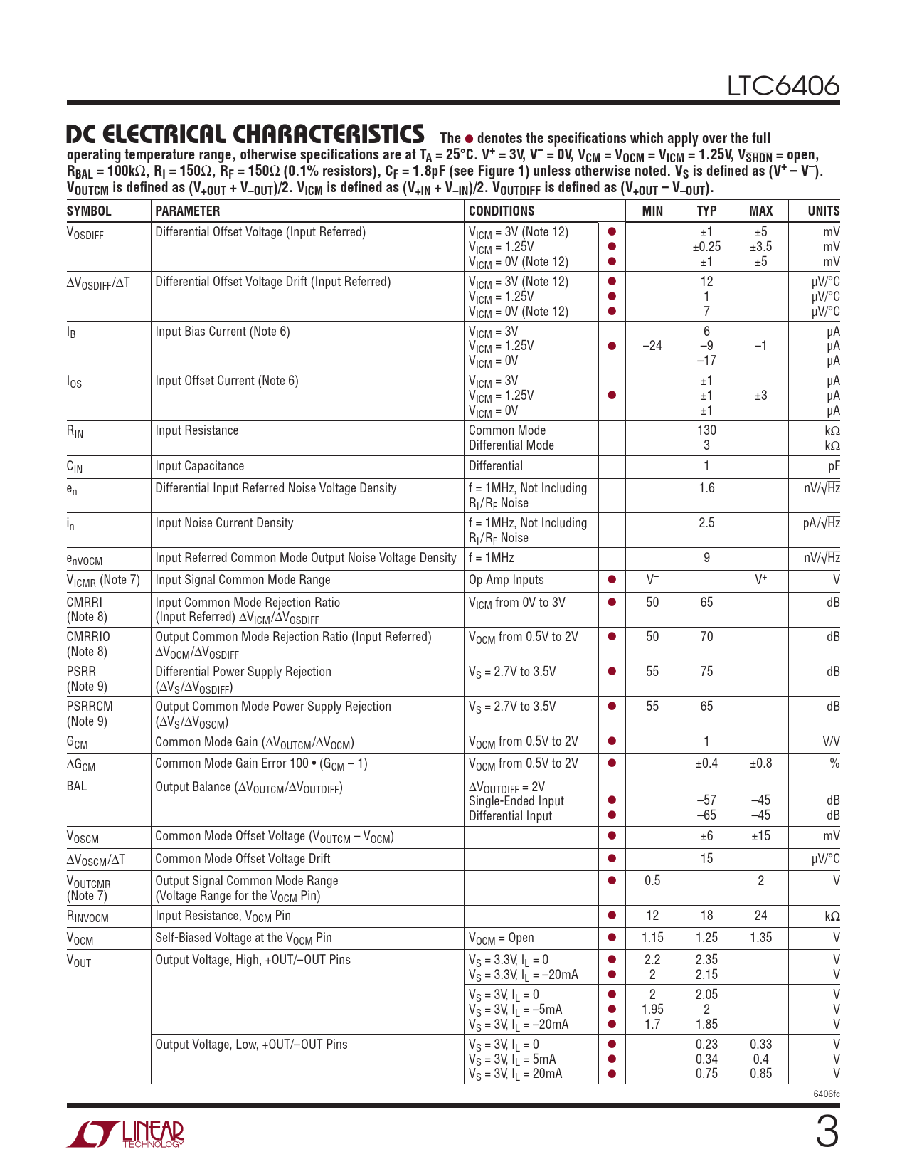 LTC6406 DC ELECTRICAL CHARACTERISTICSThe l denotes the specifi cations which apply over the fulloperating temperature range, otherwise specifi cations are at TA = 25°C. V+ = 3V, V– = 0V, VCM = VOCM = VICM = 1.25V, VSHDN = open,RBAL = 100k Ω , RI = 150 Ω , RF = 150 Ω (0.1% resistors), CF = 1.8pF (see Figure 1) unless otherwise noted. VS is defi ned as (V+ – V–).VOUTCM is defi ned as (V+OUT + V–OUT)/2. VICM is defi ned as (V+IN + V–IN)/2. VOUTDIFF is defi ned as (V+OUT – V–OUT). SYMBOLPARAMETERCONDITIONSMINTYPMAXUNITS VOSDIFF Differential Offset Voltage (Input Referred) VICM = 3V (Note 12) l ±1 ±5 mV VICM = 1.25V l ±0.25 ±3.5 mV VICM = 0V (Note 12) l ±1 ±5 mV ΔVOSDIFF/ΔT Differential Offset Voltage Drift (Input Referred) VICM = 3V (Note 12) l 12 μV/°C VICM = 1.25V l 1 μV/°C VICM = 0V (Note 12) l 7 μV/°C IB Input Bias Current (Note 6) VICM = 3V 6 μA VICM = 1.25V l –24 –9 –1 μA VICM = 0V –17 μA IOS Input Offset Current (Note 6) VICM = 3V ±1 μA VICM = 1.25V l ±1 ±3 μA VICM = 0V ±1 μA RIN Input Resistance Common Mode 130 kΩ Differential Mode 3 kΩ CIN Input Capacitance Differential 1 pF en Differential Input Referred Noise Voltage Density f = 1MHz, Not Including 1.6 nV/√Hz RI/RF Noise in Input Noise Current Density f = 1MHz, Not Including 2.5 pA/√Hz RI/RF Noise enVOCM Input Referred Common Mode Output Noise Voltage Density f = 1MHz 9 nV/√Hz VICMR (Note 7) Input Signal Common Mode Range Op Amp Inputs l V– V+ V CMRRI Input Common Mode Rejection Ratio VICM from 0V to 3V l 50 65 dB (Note 8) (Input Referred) ΔVICM/ΔVOSDIFF CMRRIO Output Common Mode Rejection Ratio (Input Referred) VOCM from 0.5V to 2V l 50 70 dB (Note 8) ΔVOCM/ΔVOSDIFF PSRR Differential Power Supply Rejection VS = 2.7V to 3.5V l 55 75 dB (Note 9) (ΔVS/ΔVOSDIFF) PSRRCM Output Common Mode Power Supply Rejection VS = 2.7V to 3.5V l 55 65 dB (Note 9) (ΔVS/ΔVOSCM) GCM Common Mode Gain (ΔVOUTCM/ΔVOCM) VOCM from 0.5V to 2V l 1 V/V ΔGCM Common Mode Gain Error 100 • (GCM – 1) VOCM from 0.5V to 2V l ±0.4 ±0.8 % BAL Output Balance (ΔVOUTCM/ΔVOUTDIFF) ΔVOUTDIFF = 2V Single-Ended Input l –57 –45 dB Differential Input l –65 –45 dB VOSCM Common Mode Offset Voltage (VOUTCM – VOCM) l ±6 ±15 mV ΔVOSCM/ΔT Common Mode Offset Voltage Drift l 15 μV/°C VOUTCMR Output Signal Common Mode Range l 0.5 2 V (Note 7) (Voltage Range for the VOCM Pin) RINVOCM Input Resistance, VOCM Pin l 12 18 24 kΩ VOCM Self-Biased Voltage at the VOCM Pin VOCM = Open l 1.15 1.25 1.35 V VOUT Output Voltage, High, +OUT/–OUT Pins VS = 3.3V, IL = 0 l 2.2 2.35 V VS = 3.3V, IL = –20mA l 2 2.15 V VS = 3V, IL = 0 l 2 2.05 V VS = 3V, IL = –5mA l 1.95 2 V VS = 3V, IL = –20mA l 1.7 1.85 V Output Voltage, Low, +OUT/–OUT Pins VS = 3V, IL = 0 l 0.23 0.33 V VS = 3V, IL = 5mA l 0.34 0.4 V VS = 3V, IL = 20mA l 0.75 0.85 V 6406fc 3