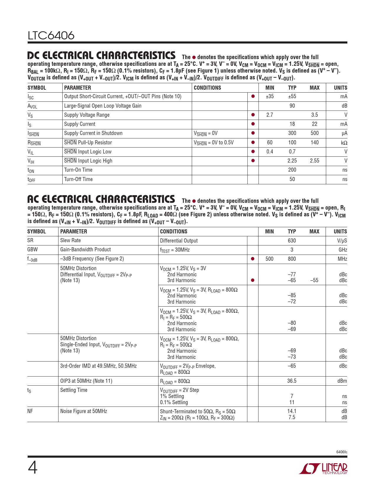 LTC6406 DC ELECTRICAL CHARACTERISTICSThe l denotes the specifi cations which apply over the fulloperating temperature range, otherwise specifi cations are at TA = 25°C. V+ = 3V, V– = 0V, VCM = VOCM = VICM = 1.25V, VSHDN = open,RBAL = 100k Ω , RI = 150 Ω , RF = 150 Ω (0.1% resistors), CF = 1.8pF (see Figure 1) unless otherwise noted. VS is defi ned as (V+ – V–).VOUTCM is defi ned as (V+OUT + V–OUT)/2. VICM is defi ned as (V+IN + V–IN)/2. VOUTDIFF is defi ned as (V+OUT – V–OUT).SYMBOLPARAMETERCONDITIONSMINTYPMAXUNITS ISC Output Short-Circuit Current, +OUT/–OUT Pins (Note 10) l ±35 ±55 mA AVOL Large-Signal Open Loop Voltage Gain 90 dB VS Supply Voltage Range l 2.7 3.5 V IS Supply Current l 18 22 mA ISHDN Supply Current in Shutdown VSHDN = 0V l 300 500 μA RSHDN SHDN Pull-Up Resistor VSHDN = 0V to 0.5V l 60 100 140 kΩ VIL SHDN Input Logic Low l 0.4 0.7 V VIH SHDN Input Logic High l 2.25 2.55 V tON Turn-On Time 200 ns tOFF Turn-Off Time 50 ns AC ELECTRICAL CHARACTERISTICSThe l denotes the specifi cations which apply over the fulloperating temperature range, otherwise specifi cations are at TA = 25°C. V+ = 3V, V– = 0V, VCM = VOCM = VICM = 1.25V, VSHDN = open, RI= 150 Ω , RF = 150 Ω (0.1% resistors), CF = 1.8pF, RLOAD = 400 Ω (see Figure 2) unless otherwise noted. VS is defi ned as (V+ – V–). VICMis defi ned as (V+IN + V–IN)/2. VOUTDIFF is defi ned as (V+OUT – V–OUT).SYMBOLPARAMETERCONDITIONSMINTYPMAXUNITS SR Slew Rate Differential Output 630 V/μS GBW Gain-Bandwidth Product fTEST = 30MHz 3 GHz f–3dB –3dB Frequency (See Figure 2) l 500 800 MHz 50MHz Distortion VOCM = 1.25V, VS = 3V Differential Input, VOUTDIFF = 2VP-P 2nd Harmonic –77 dBc (Note 13) 3rd Harmonic l –65 –55 dBc VOCM = 1.25V, VS = 3V, RLOAD = 800Ω 2nd Harmonic –85 dBc 3rd Harmonic –72 dBc VOCM = 1.25V, VS = 3V, RLOAD = 800Ω, RI = RF = 500Ω 2nd Harmonic –80 dBc 3rd Harmonic –69 dBc 50MHz Distortion VOCM = 1.25V, VS = 3V, RLOAD = 800Ω, Single-Ended Input, VOUTDIFF = 2VP-P RI = RF = 500Ω (Note 13) 2nd Harmonic –69 dBc 3rd Harmonic –73 dBc 3rd-Order IMD at 49.5MHz, 50.5MHz VOUTDIFF = 2VP-P Envelope, –65 dBc RLOAD = 800Ω OIP3 at 50MHz (Note 11) RLOAD = 800Ω 36.5 dBm tS Settling Time VOUTDIFF = 2V Step 1% Settling 7 ns 0.1% Settling 11 ns NF Noise Figure at 50MHz Shunt-Terminated to 50Ω, RS = 50Ω 14.1 dB ZIN = 200Ω (RI = 100Ω, RF = 300Ω) 7.5 dB 6406fc 4