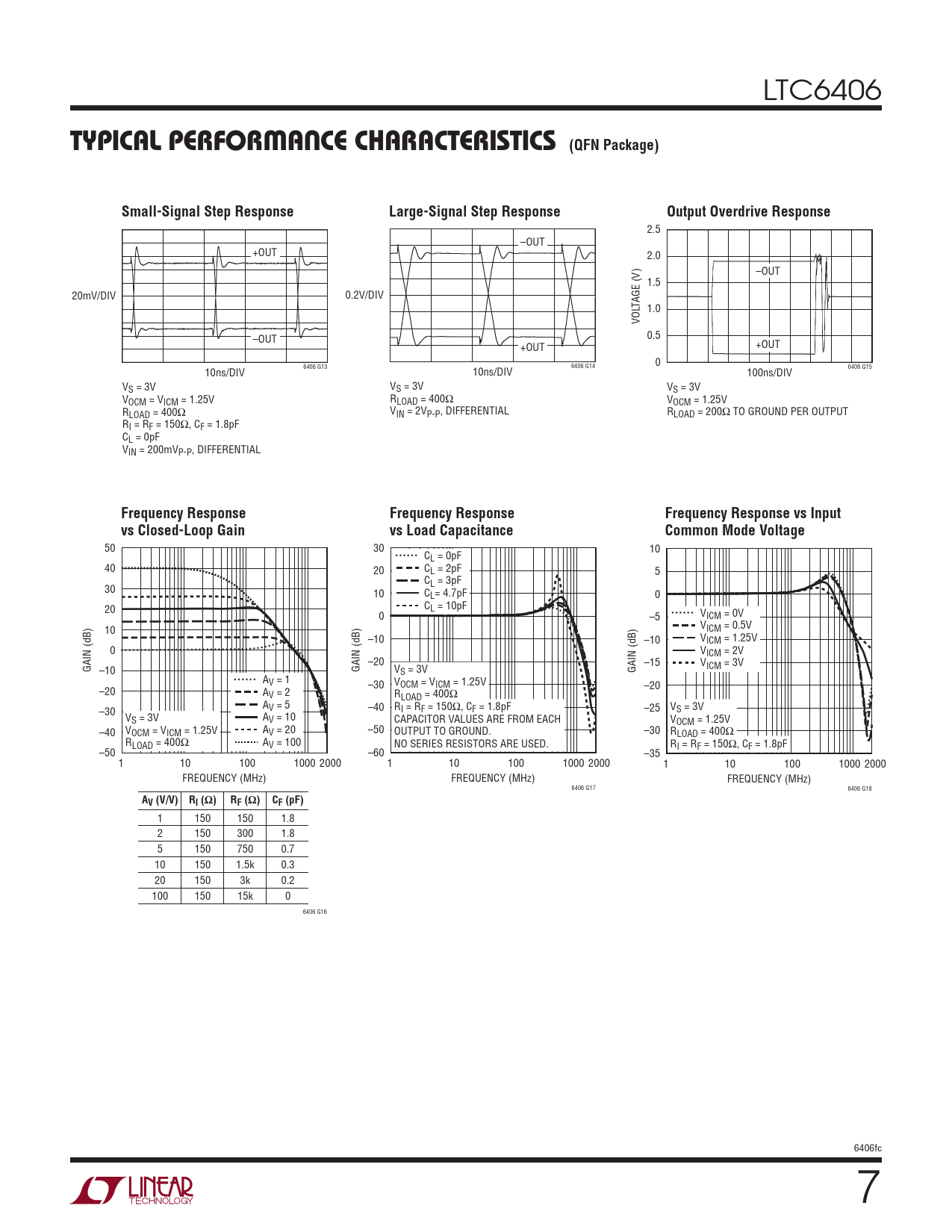 2.5 –OUT +OUT 2.0 –OUT 1.5 20mV/DIV 0.2V/DIV TAGE (V) 1.0 VOL –OUT 0.5 +OUT +OUT 0 6406 G13 6406 G14 6406 G15 10ns/DIV 10ns/DIV 100ns/DIV VS = 3V VS = 3V VS = 3V VOCM = VICM = 1.25V RLOAD = 400Ω VOCM = 1.25V RLOAD = 400Ω VIN = 2VP-P, DIFFERENTIAL RLOAD = 200Ω TO GROUND PER OUTPUT RI = RF = 150Ω, CF = 1.8pF CL = 0pF VIN = 200mVP-P, DIFFERENTIAL