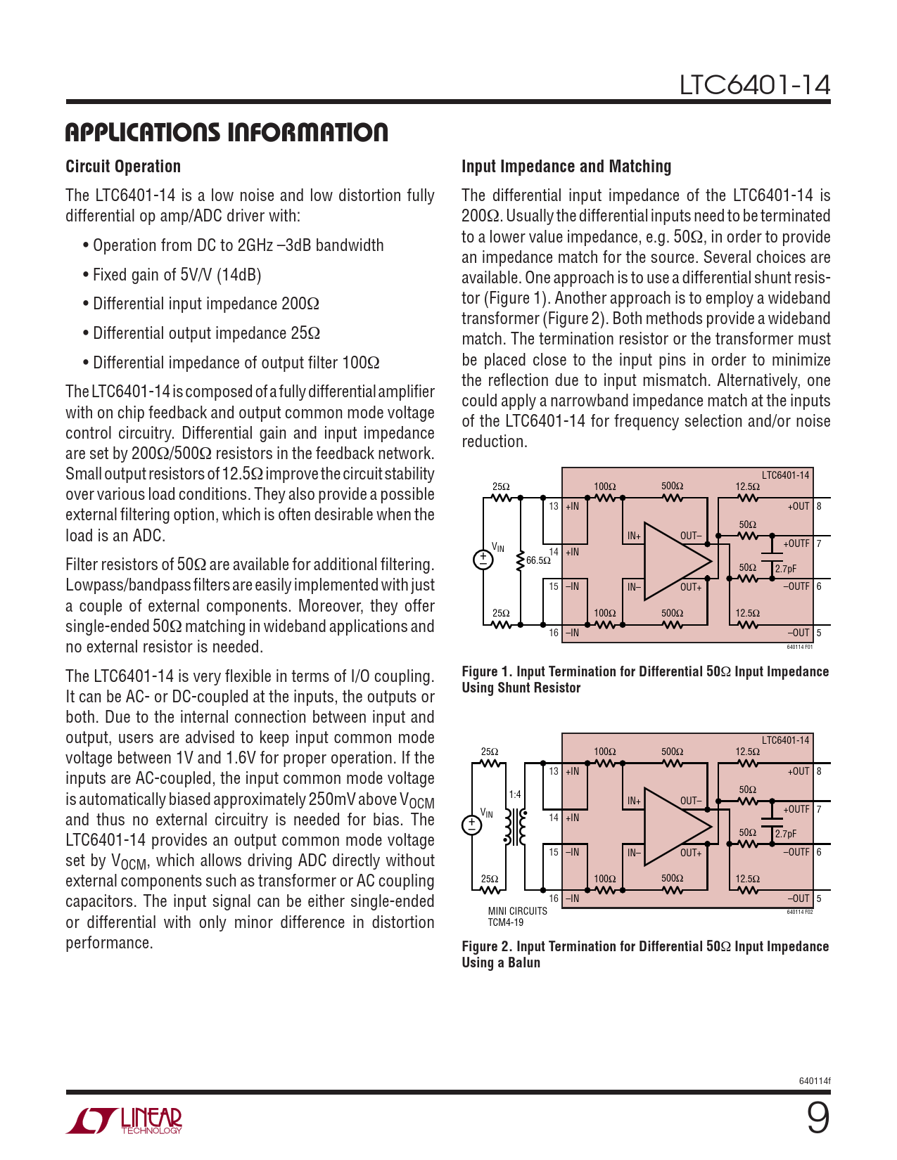 APPLICATIONS INFORMATION Circuit Operation Input Impedance and Matching Figure 1 Input Termination for Differential 50
