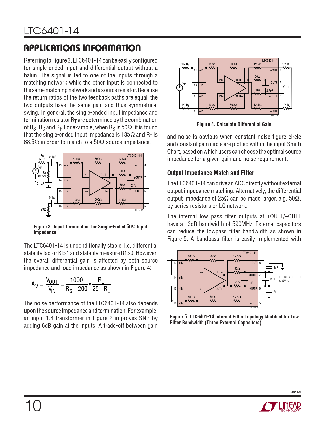 can reduce the lowpass fi lter bandwidth as shown in Figure 5. A bandpass fi lter is easily implemented with The LTC6401-14 is unconditionally stable, i.e. differential LTC6401-14 stability factor Kf>1 and stability measure B1>0. However, 100Ω 500Ω 12.5Ω the overall differential gain is affected by both source 13 +IN +OUT 8 50 impedance and load impedance as shown in Figure 4: Ω 8pF IN+ OUT– +OUTF 7 14 +IN FILTERED OUTPUT 12pF V 1000 R (87.5MHz) OUT L 50Ω 2.7pF AV = = • 15 –IN IN– OUT+ –OUTF 6 V R + 200 25+R IN S L 8pF 100Ω 500Ω 12.5Ω 16 –IN –OUT 5 The noise performance of the LTC6401-14 also depends 640114 F05 upon the source impedance and termination. For example,