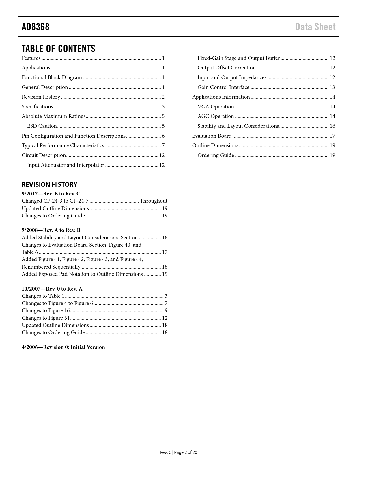页数 / 页20 / 2 — AD8368. Data Sheet. TABLE OF CONTENTS. REVISION HISTORY 9/2017—Rev. B to …