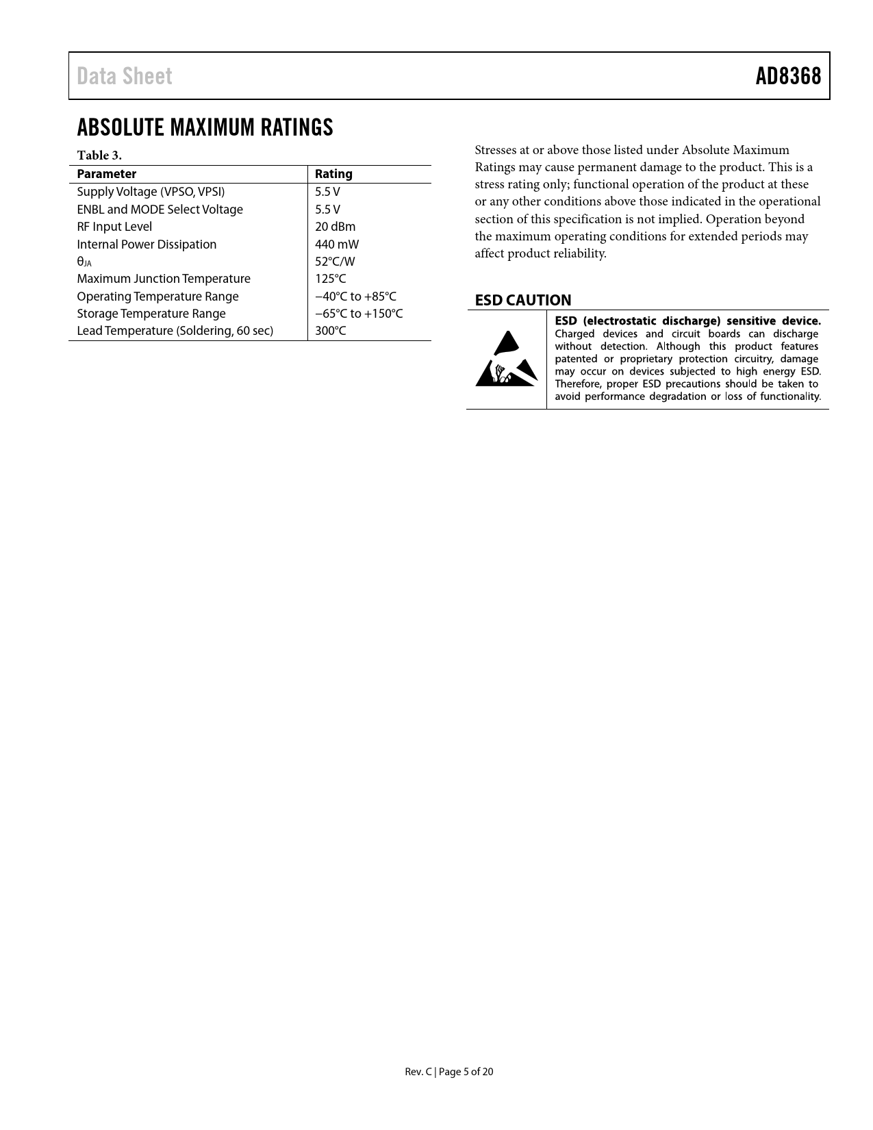 Data Sheet AD8368 ABSOLUTE MAXIMUM RATINGS Table 3 Parameter Rating ESD CAUTION