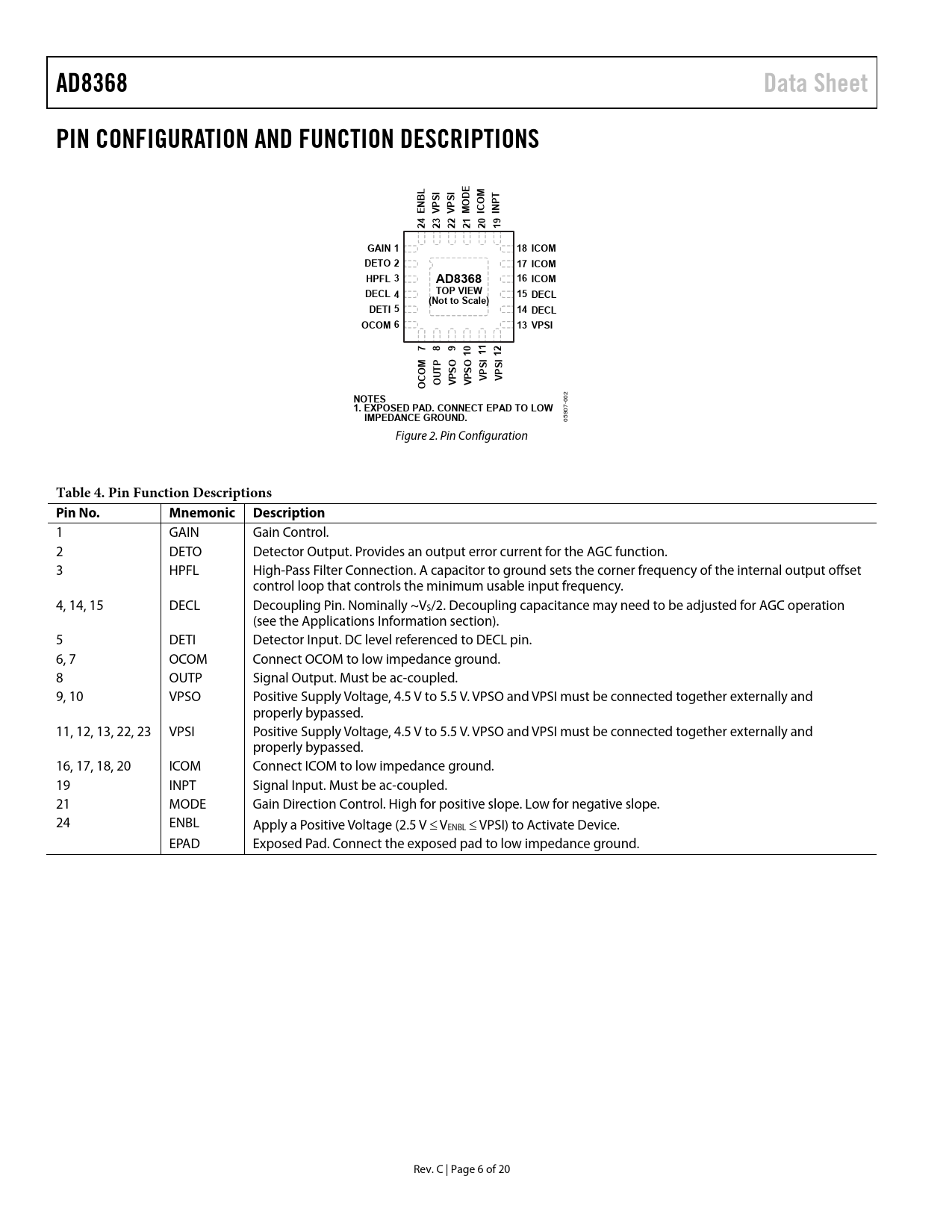 link to page 14 AD8368Data SheetPIN CONFIGURATION AND FUNCTION DESCRIPTIONSLIIEBDMTOPENVPSVPSMOICIN432102222921GAIN 118 ICOMDETO 217 ICOMHPFL 3AD836816 ICOMDECL 4TOP VIEW15 DECL(Not to Scale)DETI 514 DECLOCOM 613 VPSI789011121OOOMTPPSIPSIVVOCOUVPSVPS 2 NOTES 00 1. EXPOSED PAD. CONNECT EPAD TO LOW 5907- IMPEDANCE GROUND. 0 Figure 2. Pin Configuration Table 4. Pin Function Descriptions Pin No.MnemonicDescription 1 GAIN Gain Control. 2 DETO Detector Output. Provides an output error current for the AGC function. 3 HPFL High-Pass Filter Connection. A capacitor to ground sets the corner frequency of the internal output offset control loop that controls the minimum usable input frequency. 4, 14, 15 DECL Decoupling Pin. Nominally ~VS/2. Decoupling capacitance may need to be adjusted for AGC operation (see the Applications Information section). 5 DETI Detector Input. DC level referenced to DECL pin. 6, 7 OCOM Connect OCOM to low impedance ground. 8 OUTP Signal Output. Must be ac-coupled. 9, 10 VPSO Positive Supply Voltage, 4.5 V to 5.5 V. VPSO and VPSI must be connected together externally and properly bypassed. 11, 12, 13, 22, 23 VPSI Positive Supply Voltage, 4.5 V to 5.5 V. VPSO and VPSI must be connected together externally and properly bypassed. 16, 17, 18, 20 ICOM Connect ICOM to low impedance ground. 19 INPT Signal Input. Must be ac-coupled. 21 MODE Gain Direction Control. High for positive slope. Low for negative slope. 24 ENBL Apply a Positive Voltage (2.5 V VENBL VPSI) to Activate Device. EPAD Exposed Pad. Connect the exposed pad to low impedance ground. Rev. C | Page 6 of 20 Document Outline FEATURES APPLICATIONS FUNCTIONAL BLOCK DIAGRAM GENERAL DESCRIPTION REVISION HISTORY SPECIFICATIONS ABSOLUTE MAXIMUM RATINGS ESD CAUTION PIN CONFIGURATION AND FUNCTION DESCRIPTIONS TYPICAL PERFORMANCE CHARACTERISTICS CIRCUIT DESCRIPTION INPUT ATTENUATOR AND INTERPOLATOR FIXED-GAIN STAGE AND OUTPUT BUFFER OUTPUT OFFSET CORRECTION INPUT AND OUTPUT IMPEDANCES GAIN CONTROL INTERFACE APPLICATIONS INFORMATION VGA OPERATION AGC OPERATION STABILITY AND LAYOUT CONSIDERATIONS EVALUATION BOARD OUTLINE DIMENSIONS ORDERING GUIDE