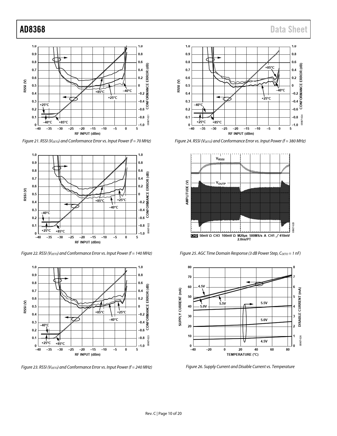 Figure 23. RSSI (VDETO) and Conformance Error vs. Input Power (f = 240 MHz) Figure 26. Supply Current and Disable Current vs. Temperature Rev. C | Page 10 of 20 Document Outline FEATURES APPLICATIONS FUNCTIONAL BLOCK DIAGRAM GENERAL DESCRIPTION REVISION HISTORY SPECIFICATIONS ABSOLUTE MAXIMUM RATINGS ESD CAUTION PIN CONFIGURATION AND FUNCTION DESCRIPTIONS TYPICAL PERFORMANCE CHARACTERISTICS CIRCUIT DESCRIPTION INPUT ATTENUATOR AND INTERPOLATOR FIXED-GAIN STAGE AND OUTPUT BUFFER OUTPUT OFFSET CORRECTION INPUT AND OUTPUT IMPEDANCES GAIN CONTROL INTERFACE APPLICATIONS INFORMATION VGA OPERATION AGC OPERATION STABILITY AND LAYOUT CONSIDERATIONS EVALUATION BOARD OUTLINE DIMENSIONS ORDERING GUIDE