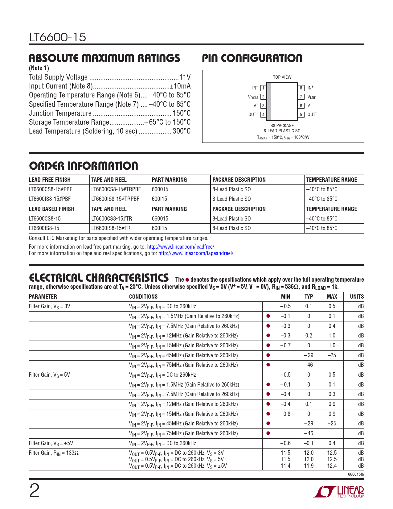 LT6600CS8-15 LT6600CS8-15#TR 660015 8-Lead Plastic SO –40°C to 85°C LT6600IS8-15 LT6600IS8-15#TR 600I15 8-Lead Plastic SO –40°C to 85°C Consult LTC Marketing for parts specifi ed with wider operating temperature ranges. For more information on lead free part marking, go to: http://www.linear.com/leadfree/ For more information on tape and reel specifi cations, go to: http://www.linear.com/tapeandreel/