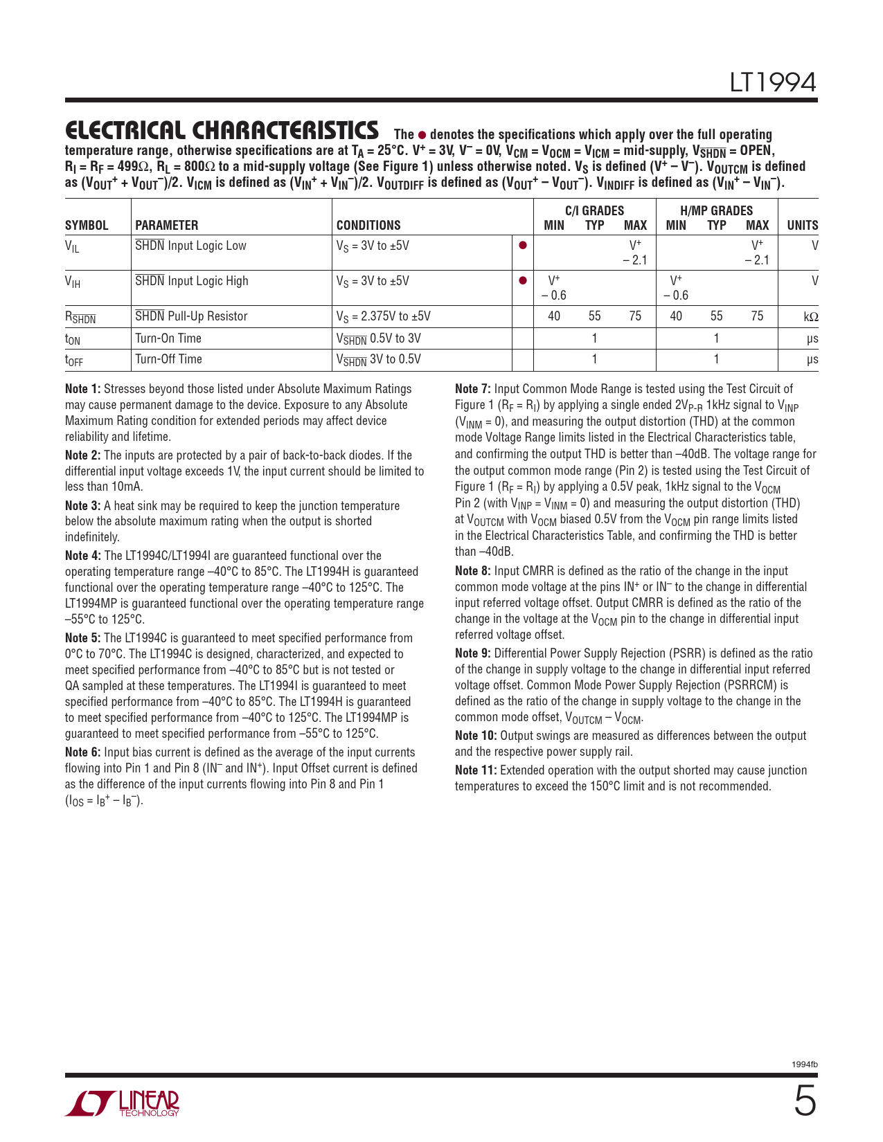 LT1994 ELECTRICAL CHARACTERISTICSThe l denotes the specifi cations which apply over the full operatingtemperature range, otherwise specifi cations are at TA = 25°C. V+ = 3V, V– = 0V, VCM = VOCM = VICM = mid-supply, VSHDN = OPEN,RI = RF = 499 Ω , RL = 800 Ω to a mid-supply voltage (See Figure 1) unless otherwise noted. VS is defi ned (V+ – V–). VOUTCM is defi nedas (V+–+–+–+–OUT + VOUT )/2. VICM is defi ned as (VIN + VIN )/2. VOUTDIFF is defi ned as (VOUT – VOUT ). VINDIFF is defi ned as (VIN – VIN ).C/I GRADESH/MP GRADESSYMBOLPARAMETERCONDITIONSMINTYPMAXMINTYPMAXUNITS VIL SHDN Input Logic Low VS = 3V to ±5V l V+ V+ V – 2.1 – 2.1 VIH SHDN Input Logic High VS = 3V to ±5V l V+ V+ V – 0.6 – 0.6 RSHDN SHDN Pull-Up Resistor VS = 2.375V to ±5V 40 55 75 40 55 75 kΩ tON Turn-On Time VSHDN 0.5V to 3V 1 1 μs tOFF Turn-Off Time VSHDN 3V to 0.5V 1 1 μs Note 1: Stresses beyond those listed under Absolute Maximum Ratings Note 7: Input Common Mode Range is tested using the Test Circuit of may cause permanent damage to the device. Exposure to any Absolute Figure 1 (RF = RI) by applying a single ended 2VP-P, 1kHz signal to VINP Maximum Rating condition for extended periods may affect device (VINM = 0), and measuring the output distortion (THD) at the common reliability and lifetime. mode Voltage Range limits listed in the Electrical Characteristics table, Note 2: The inputs are protected by a pair of back-to-back diodes. If the and confi rming the output THD is better than –40dB. The voltage range for differential input voltage exceeds 1V, the input current should be limited to the output common mode range (Pin 2) is tested using the Test Circuit of less than 10mA. Figure 1 (RF = RI) by applying a 0.5V peak, 1kHz signal to the VOCM Note 3: A heat sink may be required to keep the junction temperature Pin 2 (with VINP = VINM = 0) and measuring the output distortion (THD) below the absolute maximum rating when the output is shorted at VOUTCM with VOCM biased 0.5V from the VOCM pin range limits listed indefi nitely. in the Electrical Characteristics Table, and confi rming the THD is better Note 4: The LT1994C/LT1994I are guaranteed functional over the than –40dB. operating temperature range –40°C to 85°C. The LT1994H is guaranteed Note 8: Input CMRR is defi ned as the ratio of the change in the input functional over the operating temperature range –40°C to 125°C. The common mode voltage at the pins IN+ or IN– to the change in differential LT1994MP is guaranteed functional over the operating temperature range input referred voltage offset. Output CMRR is defi ned as the ratio of the –55°C to 125°C. change in the voltage at the VOCM pin to the change in differential input Note 5: The LT1994C is guaranteed to meet specifi ed performance from referred voltage offset. 0°C to 70°C. The LT1994C is designed, characterized, and expected to Note 9: Differential Power Supply Rejection (PSRR) is defi ned as the ratio meet specifi ed performance from –40°C to 85°C but is not tested or of the change in supply voltage to the change in differential input referred QA sampled at these temperatures. The LT1994I is guaranteed to meet voltage offset. Common Mode Power Supply Rejection (PSRRCM) is specifi ed performance from –40°C to 85°C. The LT1994H is guaranteed defi ned as the ratio of the change in supply voltage to the change in the to meet specifi ed performance from –40°C to 125°C. The LT1994MP is common mode offset, VOUTCM – VOCM. guaranteed to meet specifi ed performance from –55°C to 125°C. Note 10: Output swings are measured as differences between the output Note 6: Input bias current is defi ned as the average of the input currents and the respective power supply rail. fl owing into Pin 1 and Pin 8 (IN– and IN+). Input Offset current is defi ned Note 11: Extended operation with the output shorted may cause junction as the difference of the input currents fl owing into Pin 8 and Pin 1 temperatures to exceed the 150°C limit and is not recommended. (I + – OS = IB – IB ). 1994fb 5