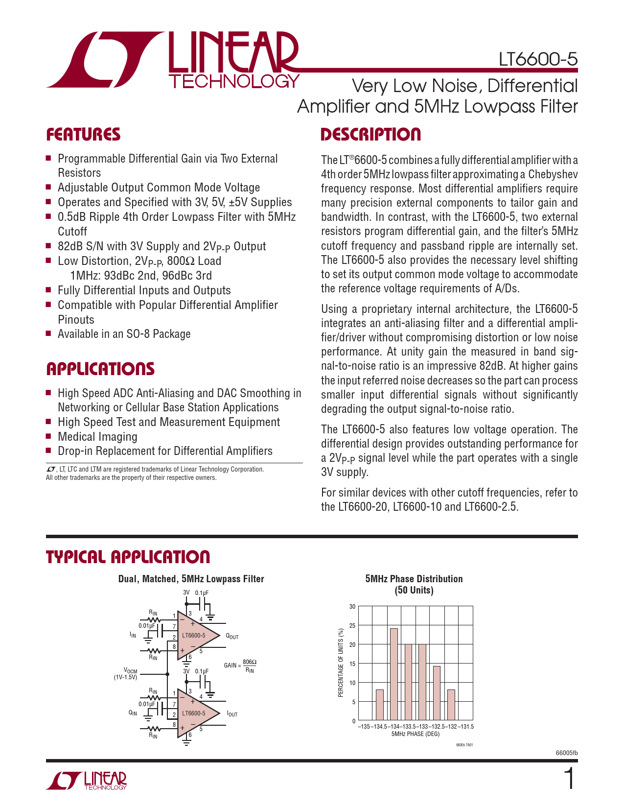 LT6600-5 Very Low Noise, Differential Amplifi er and 5MHz Lowpass Filter FEATURESDESCRIPTION n Programmable Differential Gain via Two External The LT®6600-5 combines a fully differential amplifi er with a Resistors 4th order 5MHz lowpass fi lter approximating a Chebyshev n Adjustable Output Common Mode Voltage frequency response. Most differential amplifi ers require n Operates and Specifi ed with 3V, 5V, ±5V Supplies many precision external components to tailor gain and n 0.5dB Ripple 4th Order Lowpass Filter with 5MHz bandwidth. In contrast, with the LT6600-5, two external Cutoff resistors program differential gain, and the fi lter’s 5MHz n 82dB S/N with 3V Supply and 2V cutoff frequency and passband ripple are internally set. P-P Output n Low Distortion, 2V The LT6600-5 also provides the necessary level shifting P-P, 800Ω Load 1MHz: 93dBc 2nd, 96dBc 3rd to set its output common mode voltage to accommodate n Fully Differential Inputs and Outputs the reference voltage requirements of A/Ds. n Compatible with Popular Differential Amplifi er Using a proprietary internal architecture, the LT6600-5 Pinouts integrates an anti-aliasing fi lter and a differential ampli- n Available in an SO-8 Package fi er/driver without compromising distortion or low noise performance. At unity gain the measured in band sig- nal-to-noise ratio is an impressive 82dB. At higher gains APPLICATIONS the input referred noise decreases so the part can process n High Speed ADC Anti-Aliasing and DAC Smoothing in smaller input differential signals without signifi cantly Networking or Cellular Base Station Applications degrading the output signal-to-noise ratio. n High Speed Test and Measurement Equipment The LT6600-5 also features low voltage operation. The n Medical Imaging differential design provides outstanding performance for n Drop-in Replacement for Differential Amplifi ers a 2VP-P signal level while the part operates with a single L, LT, LTC and LTM are registered trademarks of Linear Technology Corporation. 3V supply. All other trademarks are the property of their respective owners. For similar devices with other cutoff frequencies, refer to the LT6600-20, LT6600-10 and LT6600-2.5. TYPICAL APPLICATIONDual, Matched, 5MHz Lowpass Filter5MHz Phase Distribution 3V 0.1μF (50 Units) 30 RIN 3 1 – + 4 0.01μF 25 7 IIN LT6600-5 Q 2 OUT 8 – 20 + 5 RIN 6 806Ω GAIN = 15 VOCM 3V 0.1μF RIN (1V-1.5V) 10 RIN 3 1 – PERCENTAGE OF UNITS (%) + 4 0.01μF 5 7 QIN LT6600-5 I 2 OUT 8 – 0 + –135 –134.5 –134–133.5–133 –132.5–132 –131.5 5 RIN 6 5MHz PHASE (DEG) 66005 TA01 66005fb 1