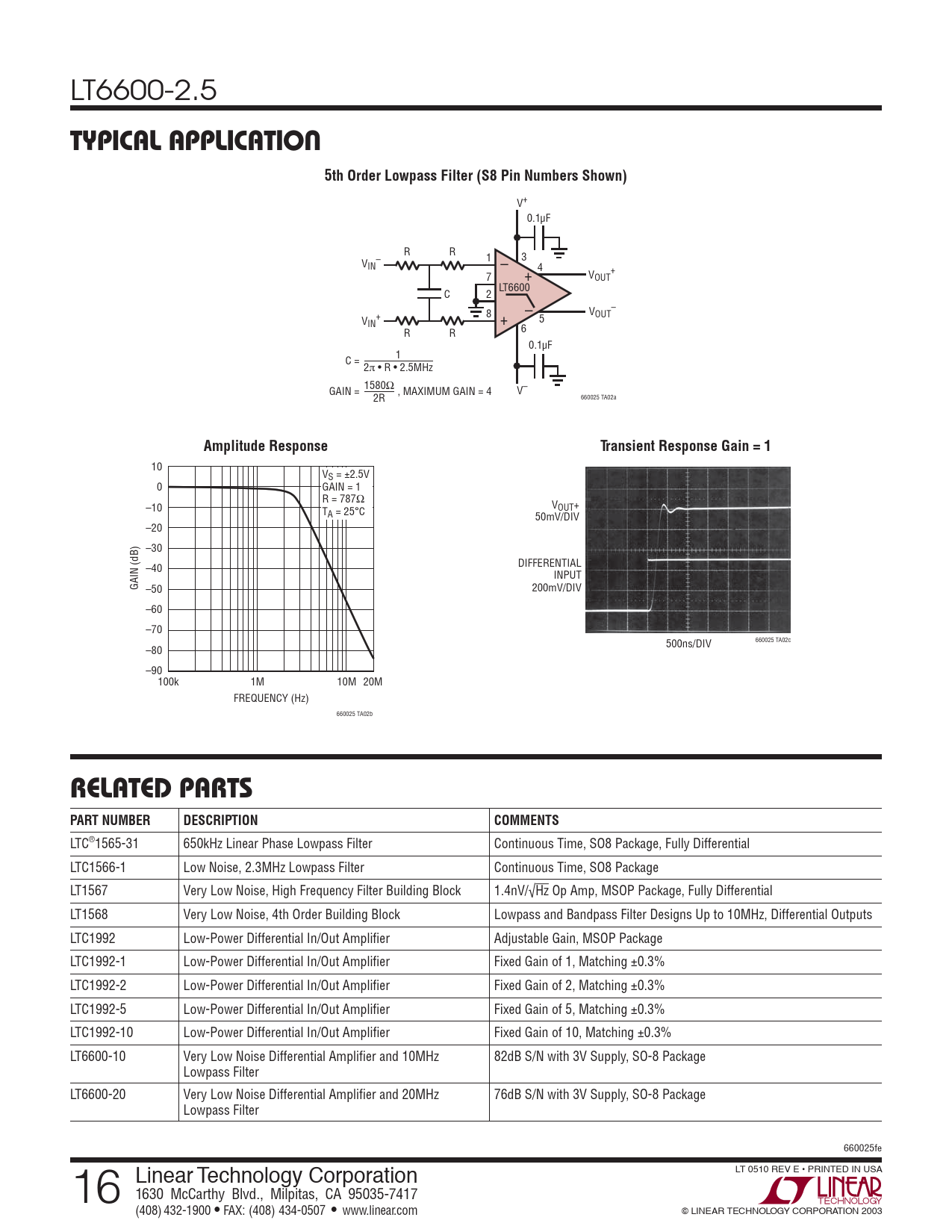 LTC®1565-31 650kHz Linear Phase Lowpass Filter Continuous Time, SO8 Package, Fully Differential LTC1566-1 Low Noise, 2.3MHz Lowpass Filter Continuous Time, SO8 Package LT1567 Very Low Noise, High Frequency Filter Building Block 1.4nV/√Hz Op Amp, MSOP Package, Fully Differential LT1568 Very Low Noise, 4th Order Building Block Lowpass and Bandpass Filter Designs Up to 10MHz, Differential Outputs LTC1992 Low-Power Differential In/Out Amplifi er Adjustable Gain, MSOP Package LTC1992-1 Low-Power Differential In/Out Amplifi er Fixed Gain of 1, Matching ±0.3% LTC1992-2 Low-Power Differential In/Out Amplifi er Fixed Gain of 2, Matching ±0.3% LTC1992-5 Low-Power Differential In/Out Amplifi er Fixed Gain of 5, Matching ±0.3% LTC1992-10 Low-Power Differential In/Out Amplifi er Fixed Gain of 10, Matching ±0.3% LT6600-10 Very Low Noise Differential Amplifi er and 10MHz 82dB S/N with 3V Supply, SO-8 Package Lowpass Filter LT6600-20 Very Low Noise Differential Amplifi er and 20MHz 76dB S/N with 3V Supply, SO-8 Package Lowpass Filter 660025fe 16 Linear Technology Corporation LT 0510 REV E • PRINTED IN USA 1630 McCarthy Blvd., Milpitas, CA 95035-7417 (408) 432-1900 ● FAX: (408) 434-0507 ● www.linear.com © LINEAR TECHNOLOGY CORPORATION 2003