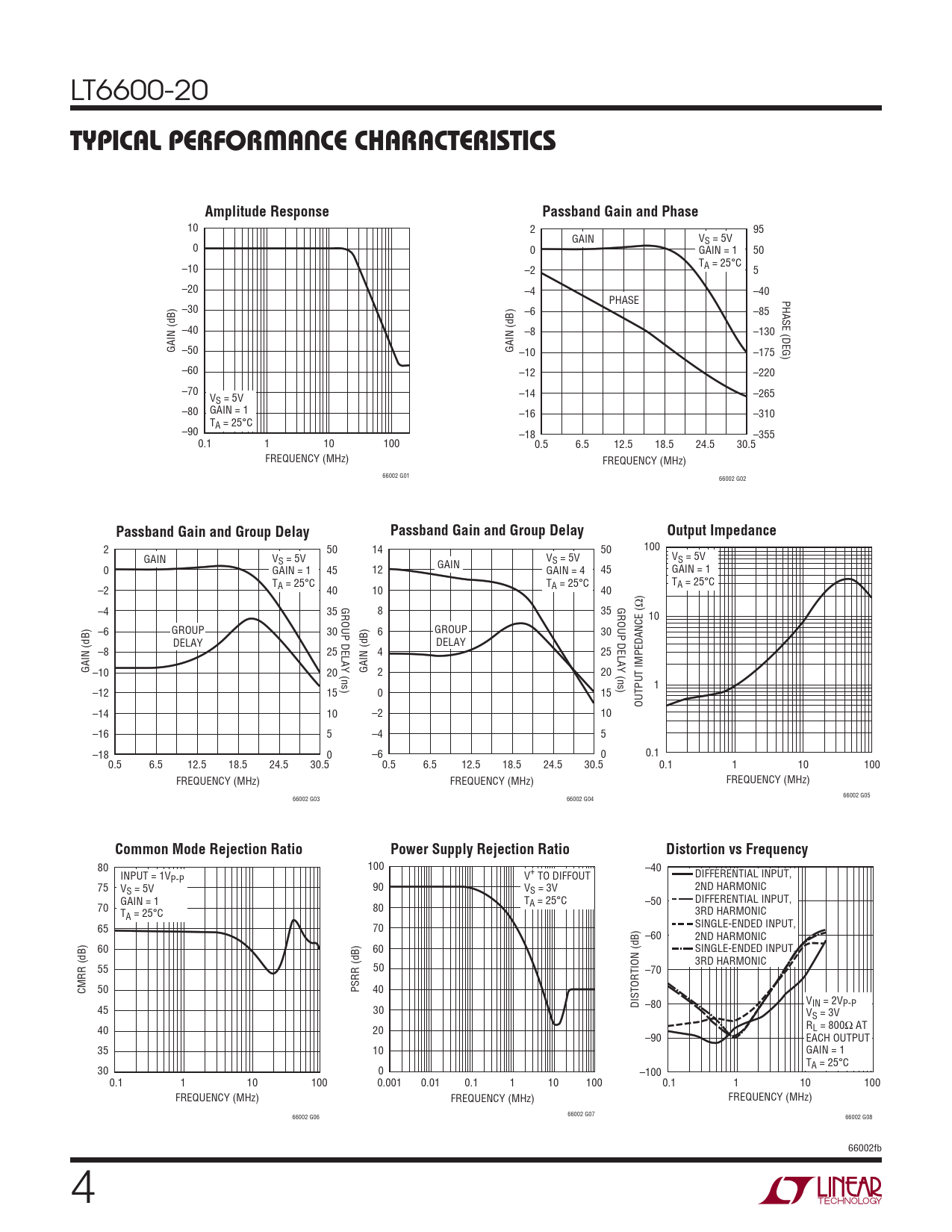 2 50 14 50 100 GAIN VS = 5V VS = 5V V GAIN S = 5V 0 GAIN = 1 45 12 GAIN = 4 45 GAIN = 1 T T TA = 25°C –2 A = 25°C 40 10 A = 25°C 40 GROUP DELAY (ns) GROUP DELAY (ns) –4 35 8 35 10 –6 GROUP 30 6 GROUP 30 DELAY DELAY –8 25 4 25 GAIN (dB) –10 20 GAIN (dB) 2 20 1 –12 15 0 15 OUTPUT IMPEDANCE (Ω) –14 10 –2 10 –16 5 –4 5 –18 0 –6 0 0.1 0.5 6.5 12.5 18.5 24.5 30.5 0.5 6.5 12.5 18.5 24.5 30.5 0.1 1 10 100 FREQUENCY (MHz) FREQUENCY (MHz) FREQUENCY (MHz) 66002 G05 66002 G03 66002 G04