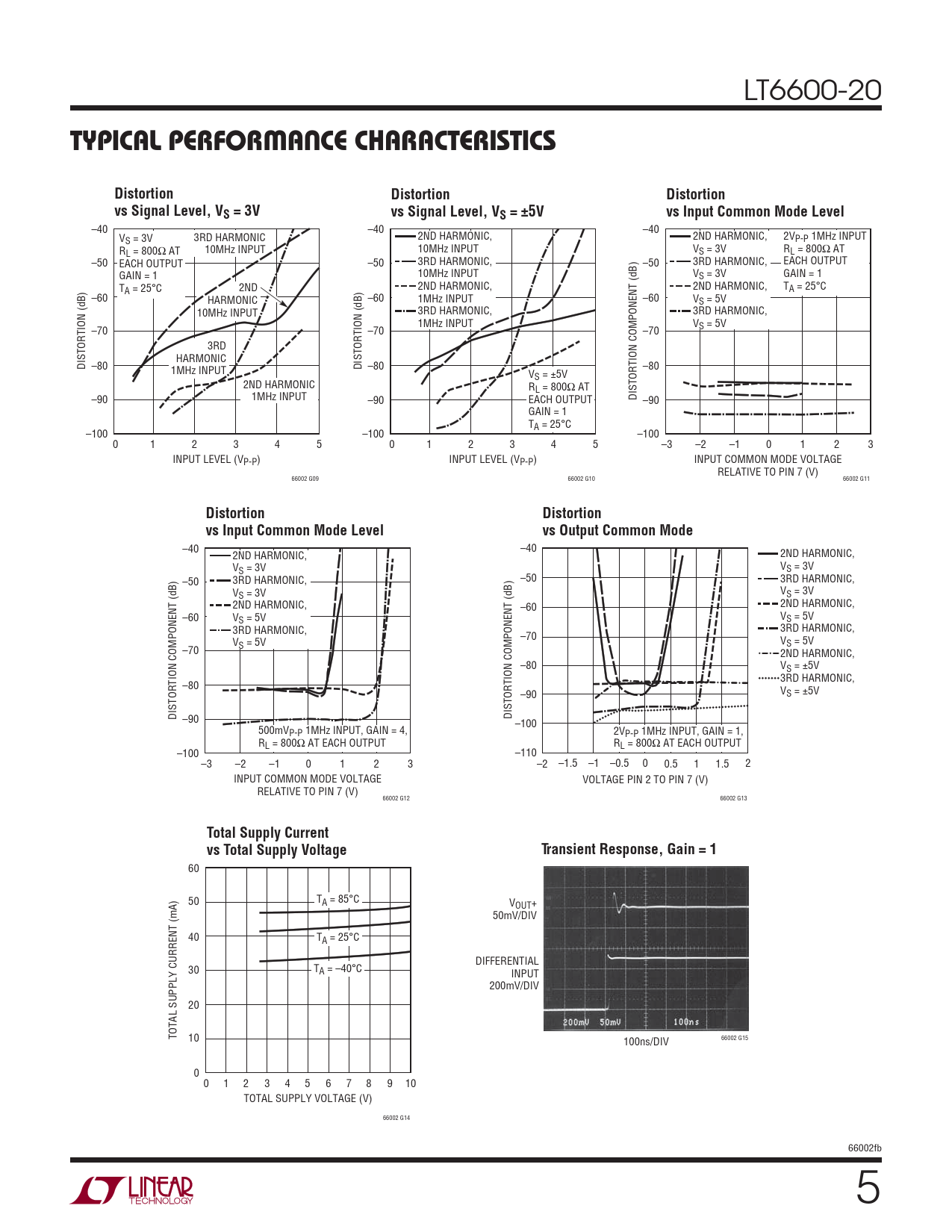 –40 –40 2ND HARMONIC, 2ND HARMONIC, VS = 3V VS = 3V –50 3RD HARMONIC, –50 3RD HARMONIC, VS = 3V VS = 3V 2ND HARMONIC, –60 2ND HARMONIC, –60 VS = 5V VS = 5V 3RD HARMONIC, 3RD HARMONIC, –70 V VS = 5V –70 S = 5V 2ND HARMONIC, –80 VS = ±5V 3RD HARMONIC, –80 –90 VS = ±5V DISTORTION COMPONENT (dB) –90 DISTORTION COMPONENT (dB) –100 500mVP-P 1MHz INPUT, GAIN = 4, 2VP-P 1MHz INPUT, GAIN = 1, RL = 800Ω AT EACH OUTPUT RL = 800Ω AT EACH OUTPUT –100 –110 –3 –2 –1 0 1 2 3 –2 –1.5 –1 –0.5 0 0.5 1 1.5 2 INPUT COMMON MODE VOLTAGE VOLTAGE PIN 2 TO PIN 7 (V) RELATIVE TO PIN 7 (V) 66002 G12 66002 G13