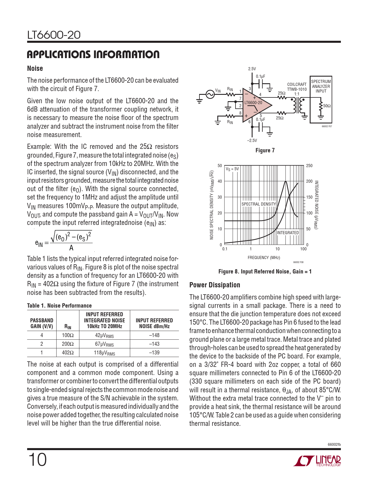 LT6600-20 APPLICATIONS INFORMATIONNoise 2.5V 0.1μF The noise performance of the LT6600-20 can be evaluated SPECTRUM COILCRAFT with the circuit of Figure 7. ANALYZER R 3 V IN TTWB-1010 IN 1 INPUT – 25Ω 1:1 7 + 4 Given the low noise output of the LT6600-20 and the LT6600-20 2 50Ω 6dB attenuation of the transformer coupling network, it 8 – is necessary to measure the noise fl oor of the spectrum + 5 0.1μF 25Ω R 6 IN analyzer and subtract the instrument noise from the fi lter 66002 F07 noise measurement. –2.5V Example: With the IC removed and the 25Ω resistors Figure 7 grounded, Figure 7, measure the total integrated noise (eS) of the spectrum analyzer from 10kHz to 20MHz. With the 50 250 IC inserted, the signal source (V ) VS = 5V IN) disconnected, and the Hz input resistors grounded, measure the total integrated noise /√ INTEGRA 40 200 RMS out of the fi lter (eO). With the signal source connected, set the frequency to 1MHz and adjust the amplitude until Y (nV TED NOISE (μ 30 150 V SPECTRAL DENSITY IN measures 100mVP-P. Measure the output amplitude, V 20 100 OUT, and compute the passband gain A = VOUT/VIN. Now V compute the input referred integratednoise (e RMS IN) as: ) 10 50 INTEGRATED (e NOISE SPECTRAL DENSIT e O )2 – (eS )2 IN = 0 0 A 0.1 1 10 100 Table 1 lists the typical input referred integrated noise for- FREQUENCY (MHz) 66002 F08 various values of RIN. Figure 8 is plot of the noise spectral Figure 8. Input Referred Noise, Gain = 1 density as a function of frequency for an LT6600-20 with RIN = 402Ω using the fi xture of Figure 7 (the instrument Power Dissipation noise has been subtracted from the results). The LT6600-20 amplifi ers combine high speed with large- Table 1. Noise Performance signal currents in a small package. There is a need to INPUT REFERRED ensure that the die junction temperature does not exceed PASSBANDINTEGRATED NOISEINPUT REFERRED 150°C. The LT6600-20 package has Pin 6 fused to the lead GAIN (V/V)RIN10kHz TO 20MHzNOISE dBm/Hz frame to enhance thermal conduction when connecting to a 4 100Ω 42μVRMS –148 ground plane or a large metal trace. Metal trace and plated 2 200Ω 67μVRMS –143 through-holes can be used to spread the heat generated by 1 402Ω 118μVRMS –139 the device to the backside of the PC board. For example, The noise at each output is comprised of a differential on a 3/32" FR-4 board with 2oz copper, a total of 660 component and a common mode component. Using a square millimeters connected to Pin 6 of the LT6600-20 transformer or combiner to convert the differential outputs (330 square millimeters on each side of the PC board) to single-ended signal rejects the common mode noise and will result in a thermal resistance, θJA, of about 85°C/W. gives a true measure of the S/N achievable in the system. Without the extra metal trace connected to the V– pin to Conversely, if each output is measured individually and the provide a heat sink, the thermal resistance will be around noise power added together, the resulting calculated noise 105°C/W. Table 2 can be used as a guide when considering level will be higher than the true differential noise. thermal resistance. 66002fb 10