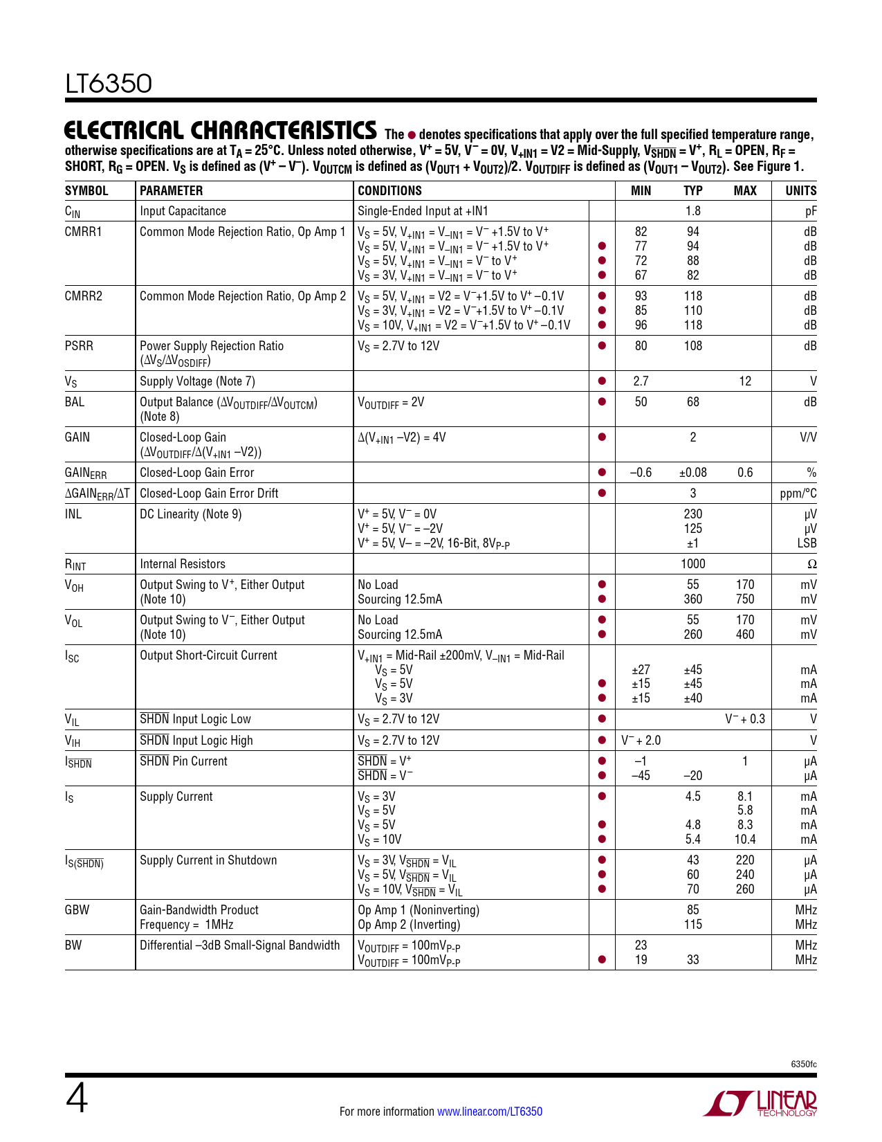 LT6350 elecTrical characTerisTicsThe l denotes specifications that apply over the full specified temperature range,otherwise specifications are at TA = 25°C. Unless noted otherwise, V+ = 5V, V– = 0V, V+IN1 = V2 = Mid-Supply, VSHDN = V+, RL = OPEN, RF =SHORT, RG = OPEN. VS is defined as (V+ – V–). VOUTCM is defined as (VOUT1 + VOUT2)/2. VOUTDIFF is defined as (VOUT1 – VOUT2). See Figure 1. SYMBOLPARAMETERCONDITIONSMINTYPMAXUNITS CIN Input Capacitance Single-Ended Input at +IN1 1.8 pF CMRR1 Common Mode Rejection Ratio, Op Amp 1 VS = 5V, V+IN1 = V–IN1 = V– +1.5V to V+ 82 94 dB VS = 5V, V+IN1 = V–IN1 = V– +1.5V to V+ l 77 94 dB VS = 5V, V+IN1 = V–IN1 = V– to V+ l 72 88 dB VS = 3V, V+IN1 = V–IN1 = V– to V+ l 67 82 dB CMRR2 Common Mode Rejection Ratio, Op Amp 2 VS = 5V, V+IN1 = V2 = V–+1.5V to V+ –0.1V l 93 118 dB VS = 3V, V+IN1 = V2 = V–+1.5V to V+ –0.1V l 85 110 dB VS = 10V, V+IN1 = V2 = V–+1.5V to V+ –0.1V l 96 118 dB PSRR Power Supply Rejection Ratio VS = 2.7V to 12V l 80 108 dB (∆VS/∆VOSDIFF) VS Supply Voltage (Note 7) l 2.7 12 V BAL Output Balance (∆VOUTDIFF/∆VOUTCM) VOUTDIFF = 2V l 50 68 dB (Note 8) GAIN Closed-Loop Gain ∆(V+IN1 –V2) = 4V l 2 V/V (∆VOUTDIFF/∆(V+IN1 –V2)) GAINERR Closed-Loop Gain Error l –0.6 ±0.08 0.6 % ∆GAINERR/∆T Closed-Loop Gain Error Drift l 3 ppm/°C INL DC Linearity (Note 9) V+ = 5V, V– = 0V 230 µV V+ = 5V, V– = –2V 125 µV V+ = 5V, V– = –2V, 16-Bit, 8VP-P ±1 LSB RINT Internal Resistors 1000 Ω VOH Output Swing to V+, Either Output No Load l 55 170 mV (Note 10) Sourcing 12.5mA l 360 750 mV VOL Output Swing to V–, Either Output No Load l 55 170 mV (Note 10) Sourcing 12.5mA l 260 460 mV ISC Output Short-Circuit Current V+IN1 = Mid-Rail ±200mV, V–IN1 = Mid-Rail VS = 5V ±27 ±45 mA VS = 5V l ±15 ±45 mA VS = 3V l ±15 ±40 mA VIL SHDN Input Logic Low VS = 2.7V to 12V l V– + 0.3 V VIH SHDN Input Logic High VS = 2.7V to 12V l V– + 2.0 V ISHDN SHDN Pin Current SHDN = V+ l –1 1 µA SHDN = V– l –45 –20 µA IS Supply Current VS = 3V l 4.5 8.1 mA VS = 5V 5.8 mA VS = 5V l 4.8 8.3 mA VS = 10V l 5.4 10.4 mA IS(SHDN) Supply Current in Shutdown VS = 3V, VSHDN = VIL l 43 220 µA VS = 5V, VSHDN = VIL l 60 240 µA VS = 10V, VSHDN = VIL l 70 260 µA GBW Gain-Bandwidth Product Op Amp 1 (Noninverting) 85 MHz Frequency = 1MHz Op Amp 2 (Inverting) 115 MHz BW Differential –3dB Small-Signal Bandwidth VOUTDIFF = 100mVP-P 23 MHz VOUTDIFF = 100mVP-P l 19 33 MHz 6350fc 4 For more information www.linear.com/LT6350 Document Outline Features Applications Description Typical Application Absolute Maximum Ratings Pin Configuration order information Electrical Characteristics Typical Performance Characteristics Pin Functions Block Diagram DC Test Circuit Operation Applications Information Typical Application Package Description Revision History Typical Application Related Parts