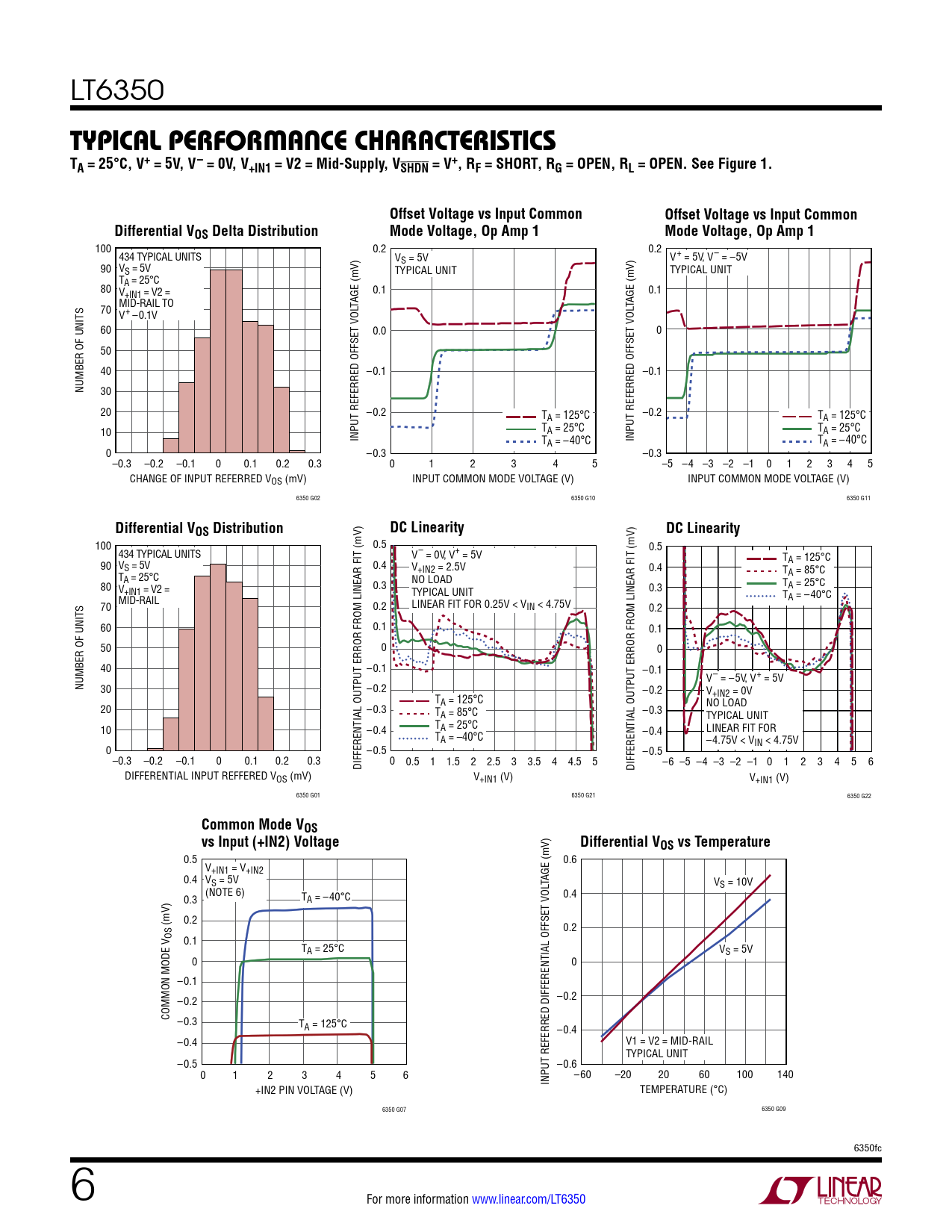 LT6350 Typical perForMance characTerisTicsTA = 25°C, V+ = 5V, V– = 0V, V+IN1 = V2 = Mid-Supply, VSHDN = V+, RF = SHORT, RG = OPEN, RL = OPEN. See Figure 1.Offset Voltage vs Input CommonOffset Voltage vs Input CommonDifferential VOS Delta DistributionMode Voltage, Op Amp 1Mode Voltage, Op Amp 1 100 0.2 0.2 434 TYPICAL UNITS VS = 5V V+ = 5V, V– = –5V 90 VS = 5V TYPICAL UNIT TYPICAL UNIT T 80 A = 25°C V 0.1 0.1 +IN1 = V2 = MID-RAIL TO TAGE (mV) TAGE (mV) 70 V+ –0.1V 60 0.0 0 50 40 –0.1 –0.1 NUMBER OF UNITS 30 20 –0.2 T –0.2 A = 125°C TA = 125°C T TA = 25°C 10 INPUT REFERRED OFFSET VOL A = 25°C T INPUT REFERRED OFFSET VOL A = –40°C TA = –40°C 0 –0.3 –0.3 –0.3 –0.2 –0.1 0 0.1 0.2 0.3 0 1 2 3 4 5 –5 –4 –3 –2 –1 0 1 2 3 4 5 CHANGE OF INPUT REFERRED VOS (mV) INPUT COMMON MODE VOLTAGE (V) INPUT COMMON MODE VOLTAGE (V) 6350 G02 6350 G10 6350 G11 Differential VOS DistributionDC LinearityDC Linearity 100 0.5 0.5 434 TYPICAL UNITS V– = 0V, V+ = 5V T 90 V A = 125°C S = 5V 0.4 V+IN2 = 2.5V 0.4 T T NO LOAD A = 85°C 80 A = 25°C V 0.3 TA = 25°C +IN1 = V2 = TYPICAL UNIT 0.3 MID-RAIL TA = –40°C 70 0.2 LINEAR FIT FOR 0.25V < VIN < 4.75V 0.2 60 0.1 0.1 50 0 0 40 –0.1 –0.1 V– = –5V, V+ = 5V NUMBER OF UNITS 30 –0.2 –0.2 V T +IN2 = 0V A = 125°C 20 –0.3 NO LOAD TA = 85°C –0.3 TYPICAL UNIT 10 –0.4 TA = 25°C LINEAR FIT FOR T –0.4 A = –40°C –4.75V < VIN < 4.75V 0 –0.5 –0.5 –0.3 –0.2 –0.1 0 0.1 0.2 0.3 0 DIFFERENTIAL OUTPUT ERROR FROM LINEAR FIT (mV) 0.5 1 1.5 2 2.5 3 3.5 4 4.5 5 –6 DIFFERENTIAL OUTPUT ERROR FROM LINEAR FIT (mV) –5 –4 –3 –2 –1 0 1 2 3 4 5 6 DIFFERENTIAL INPUT REFFERED VOS (mV) V+IN1 (V) V+IN1 (V) 6350 G01 6350 G21 6350 G22 Common Mode VOSvs Input (+IN2) VoltageDifferential VOS vs Temperature 0.5 0.6 V+IN1 = V+IN2 0.4 VS = 5V TAGE (mV) VS = 10V (NOTE 6) 0.3 T 0.4 A = –40°C (mV) 0.2 0.2 OS 0.1 TA = 25°C VS = 5V 0 0 –0.1 –0.2 –0.2 COMMON MODE V –0.3 TA = 125°C –0.4 –0.4 V1 = V2 = MID-RAIL TYPICAL UNIT –0.5 –0.6 0 1 2 3 4 5 6 –60 INPUT REFERRED DIFFERENTIAL OFFSET VOL –20 20 60 100 140 +IN2 PIN VOLTAGE (V) TEMPERATURE (°C) 6350 G07 6350 G09 6350fc 6 For more information www.linear.com/LT6350 Document Outline Features Applications Description Typical Application Absolute Maximum Ratings Pin Configuration order information Electrical Characteristics Typical Performance Characteristics Pin Functions Block Diagram DC Test Circuit Operation Applications Information Typical Application Package Description Revision History Typical Application Related Parts