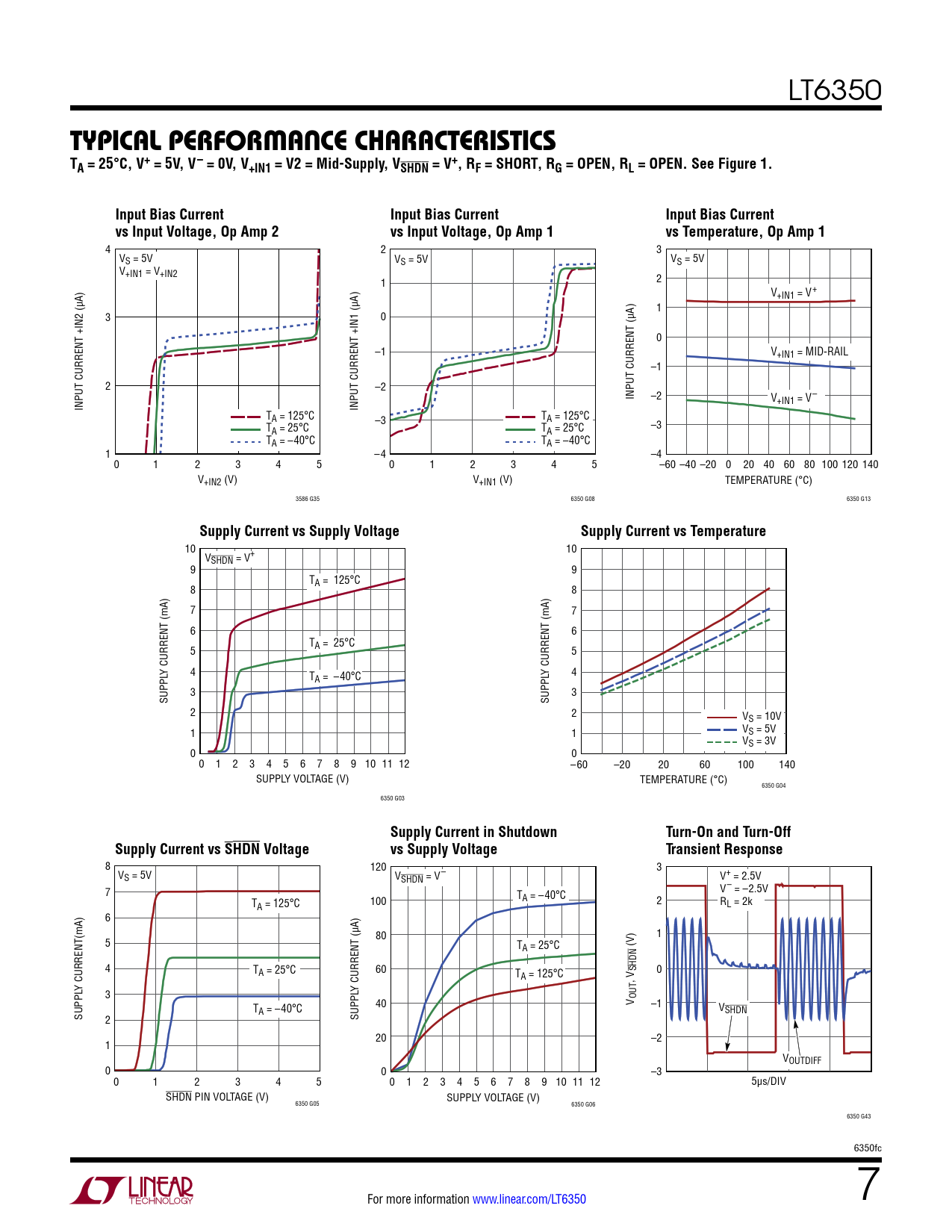 4 2 3 VS = 5V VS = 5V VS = 5V V+IN1 = V+IN2 1 2 V+IN1 = V+ 1 3 0 0 –1 V+IN1 = MID-RAIL –1 2 –2 INPUT CURRENT (µA) –2 V INPUT CURRENT +IN2 (µA) INPUT CURRENT +IN1 (µA) +IN1 = V– TA = 125°C –3 TA = 125°C T –3 A = 25°C TA = 25°C TA = –40°C TA = –40°C 1 –4 –4 0 1 2 3 4 5 0 1 2 3 4 5 –60 –40 –20 0 20 40 60 80 100 120 140 V+IN2 (V) V+IN1 (V) TEMPERATURE (°C) 3586 G35 6350 G08 6350 G13
