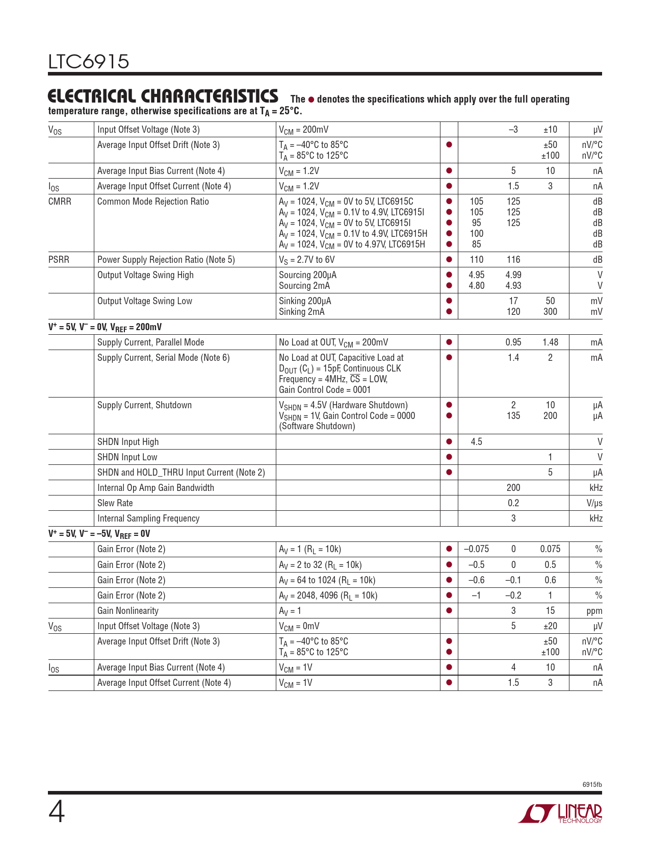 LTC6915 elecTrical characTerisTicsThe l denotes the specifications which apply over the full operatingtemperature range, otherwise specifications are at TA = 25°C. VOS Input Offset Voltage (Note 3) VCM = 200mV –3 ±10 µV Average Input Offset Drift (Note 3) TA = –40°C to 85°C l ±50 nV/°C TA = 85°C to 125°C ±100 nV/°C Average Input Bias Current (Note 4) VCM = 1.2V l 5 10 nA IOS Average Input Offset Current (Note 4) VCM = 1.2V l 1.5 3 nA CMRR Common Mode Rejection Ratio AV = 1024, VCM = 0V to 5V, LTC6915C l 105 125 dB AV = 1024, VCM = 0.1V to 4.9V, LTC6915I l 105 125 dB AV = 1024, VCM = 0V to 5V, LTC6915I l 95 125 dB AV = 1024, VCM = 0.1V to 4.9V, LTC6915H l 100 dB AV = 1024, VCM = 0V to 4.97V, LTC6915H l 85 dB PSRR Power Supply Rejection Ratio (Note 5) VS = 2.7V to 6V l 110 116 dB Output Voltage Swing High Sourcing 200µA l 4.95 4.99 V Sourcing 2mA l 4.80 4.93 V Output Voltage Swing Low Sinking 200µA l 17 50 mV Sinking 2mA l 120 300 mV V+ = 5V, V– = 0V, VREF = 200mV Supply Current, Parallel Mode No Load at OUT, VCM = 200mV l 0.95 1.48 mA Supply Current, Serial Mode (Note 6) No Load at OUT, Capacitive Load at l 1.4 2 mA DOUT (CL) = 15pF, Continuous CLK Frequency = 4MHz, CS = LOW, Gain Control Code = 0001 Supply Current, Shutdown VSHDN = 4.5V (Hardware Shutdown) l 2 10 µA VSHDN = 1V, Gain Control Code = 0000 l 135 200 µA (Software Shutdown) SHDN Input High l 4.5 V SHDN Input Low l 1 V SHDN and HOLD_THRU Input Current (Note 2) l 5 µA Internal Op Amp Gain Bandwidth 200 kHz Slew Rate 0.2 V/µs Internal Sampling Frequency 3 kHz V+ = 5V, V– = –5V, VREF = 0V Gain Error (Note 2) AV = 1 (RL = 10k) l –0.075 0 0.075 % Gain Error (Note 2) AV = 2 to 32 (RL = 10k) l –0.5 0 0.5 % Gain Error (Note 2) AV = 64 to 1024 (RL = 10k) l –0.6 –0.1 0.6 % Gain Error (Note 2) AV = 2048, 4096 (RL = 10k) l –1 –0.2 1 % Gain Nonlinearity AV = 1 l 3 15 ppm VOS Input Offset Voltage (Note 3) VCM = 0mV 5 ±20 µV Average Input Offset Drift (Note 3) TA = –40°C to 85°C l ±50 nV/°C TA = 85°C to 125°C l ±100 nV/°C IOS Average Input Bias Current (Note 4) VCM = 1V l 4 10 nA Average Input Offset Current (Note 4) VCM = 1V l 1.5 3 nA 6915fb 4 Document Outline Features Applications Description Typical Application Absolute Maximum Ratings Pin Configuration Order Information Electrical Characteristics Typical Performance Characteristics Pin Functions Block Diagrams Timing Diagram Operation Typical Application Package Description Revision History Typical Application Related Parts