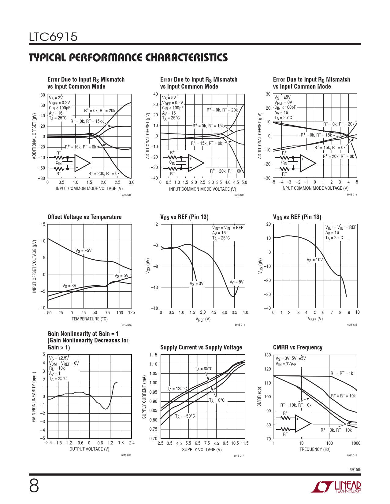 80 40 30 VS = 3V VS = 5V VS = ±5V V 60 VREF = 0.2V 30 VREF = 0.2V REF = 0V CIN < 100pF CIN < 100pF R+ = 0k, R– = 20k 20 CIN < 100pF A R+ = 0k, R– = 20k A A 40 V = 16 20 V = 16 V = 16 TA = 25°C T T R+ = 0k, R– = 15k A = 25°C A = 25°C 10 20 10 R+ = 0k, R– = 15k R+ = 0k, R– = 20k 0 0 0 R+ = 0k, R– = 15k R+ = 15k, R– = 0k –20 R+ = 15k, R– = 0k –10 –10 R+ = 15k, R– = 0k R+ R+ R+ ADDITIONAL OFFSET (µV) –40 + ADDITIONAL OFFSET (µV) –20 + ADDITIONAL OFFSET (µV) + R+ = 20k, R– = 0k CIN CIN –20 CIN –60 – –30 – – R+ = 20k, R– = 0k R– R+ = 20k, R– = 0k R– R– –80 –40 –30 0 0.5 1.0 1.5 2.0 2.5 3.0 0 0.5 1.0 1.5 2.0 2.5 3.0 3.5 4.0 4.5 5.0 –5 –4 –3 –2 –1 0 1 2 3 4 5 INPUT COMMON MODE VOLTAGE (V) INPUT COMMON MODE VOLTAGE (V) INPUT COMMON MODE VOLTAGE (V) 6915 G10 6915 G11 6915 G12