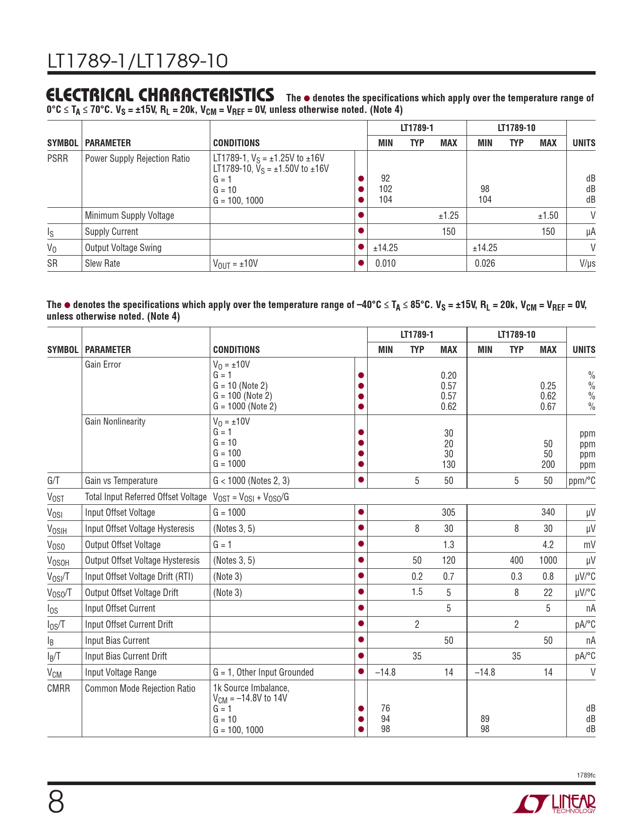 denotes the specifications which apply over the temperature range of 0°C ≤ TA ≤ 70°C. VS = ±15V, RL = 20k, VCM = VREF = 0V, unless otherwise noted. (Note 4) LT1789-1 LT1789-10 SYMBOL PARAMETER CONDITIONS MIN TYP MAX MIN TYP MAX UNITS